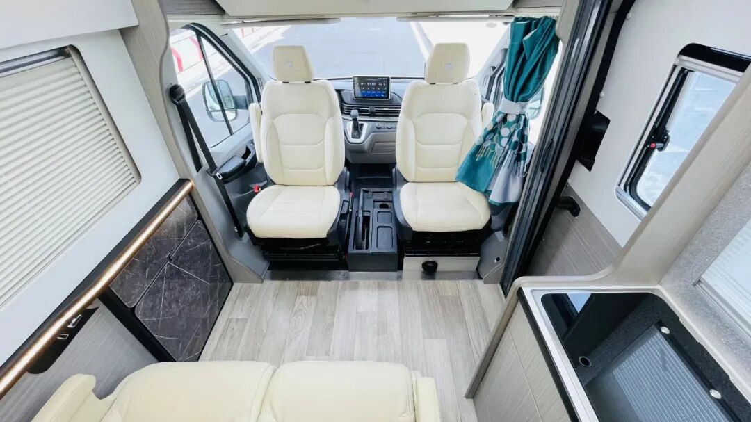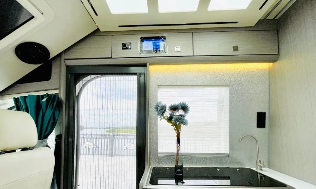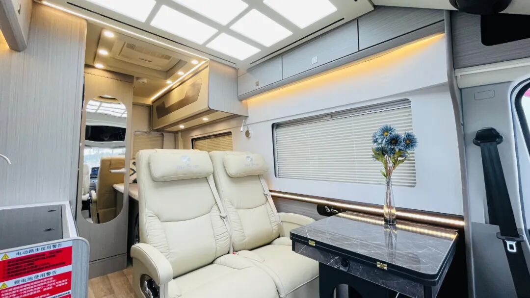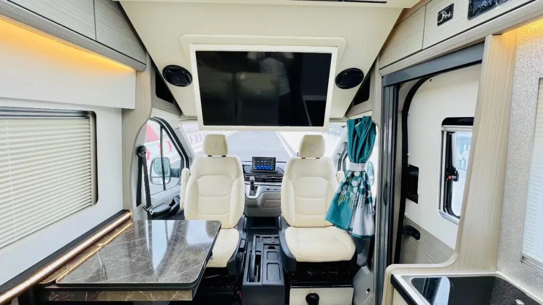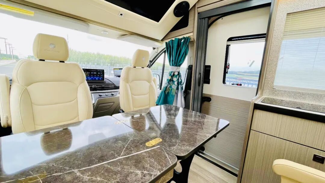 驾驶区后方就是内部生活区,包含了会客区、休息区、厨房区及卫浴区,布局清晰明了,且内饰采用环保级板材,健康无异味。