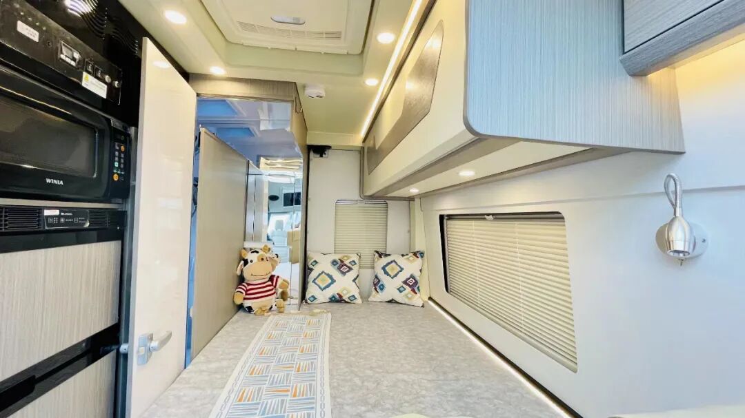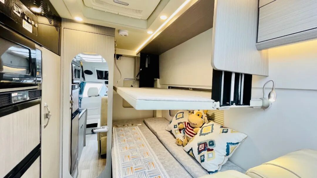 当然,如果出行人数较多的话也不用担心,纵床上方装有电动升降吊柜,可以降下来变成一张单人床,同时也可以选装前置双人升降床,不会影响到日常生活,进一步增加睡卧空间。