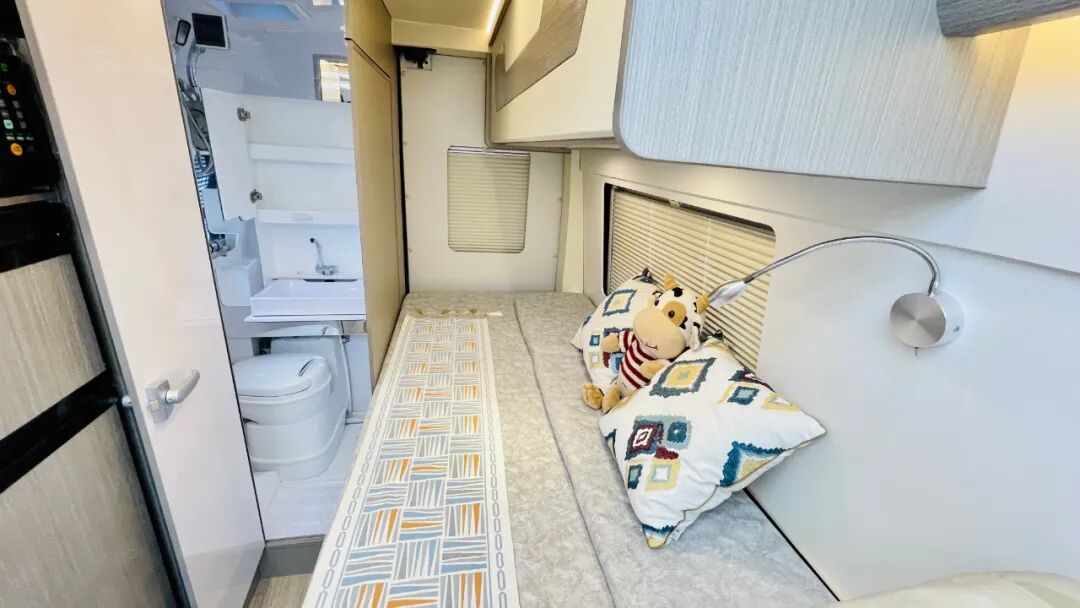 尾部休息区设有可拓展纵床,轻松容纳两人自由躺卧,日常也可将其收起来扩大生活空间;床铺侧边的通风窗可以保证房车内部的空气流通,同时还安装有阅读灯和电源插座,平常休息时可以看看书或玩玩手机都是很方便的。