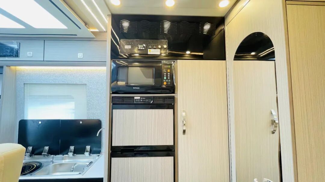会客区右侧是厨房区的位置,配备了电磁炉及不锈钢洗菜池,在不使用时可将盖板放下来作为一个小吧台来使用;旁边还有一台大宇微波炉及房车专用12V冰箱,可以储存许多旅途所需食材;厨房区的上下方都装有带锁扣的储物柜,能有效避免行车过程中因车辆颠簸而造成的物品跌落。