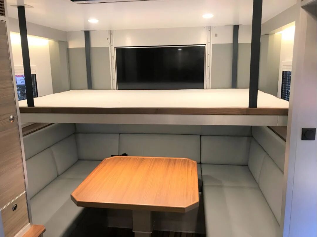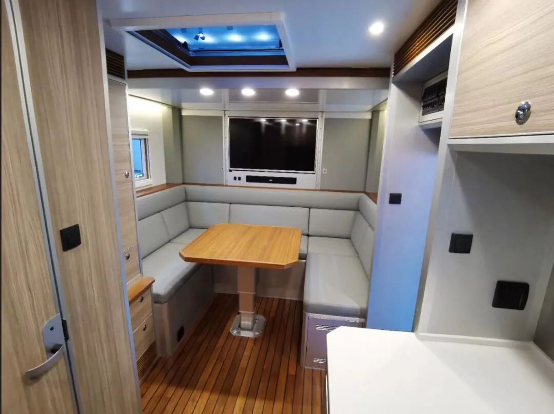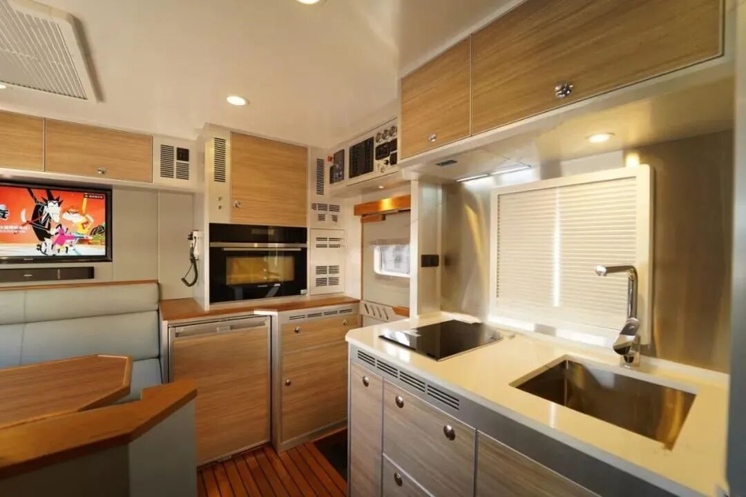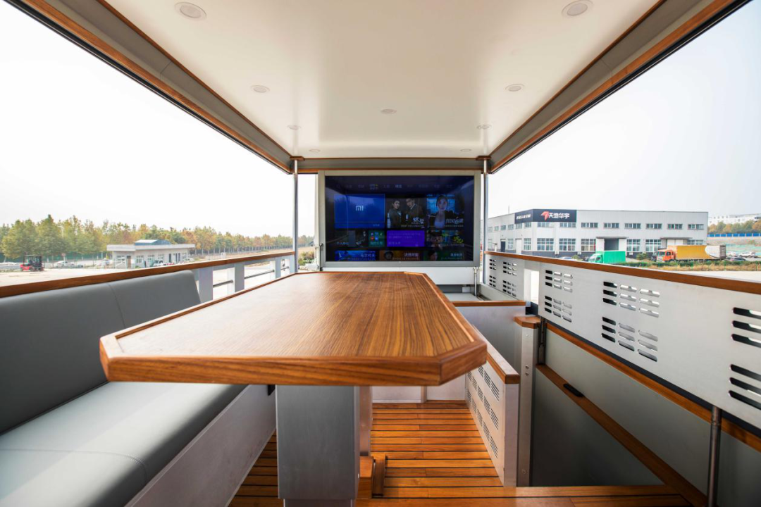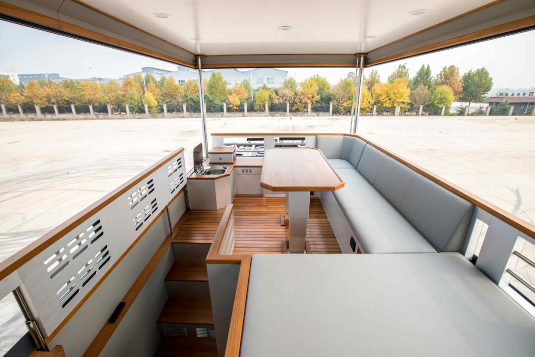 · 一键游艇飞桥开放式露台,360°宽阔视野,配置隐藏式75寸LED液晶电视+英国进口音响;