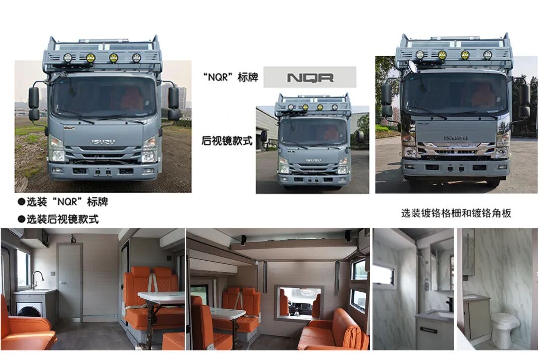 发动机净功率值:138kW;随底盘选装后视镜款式及“NQR”标牌,镀铬格栅和镀铬角板。该车型可选装ETC车载装置。车顶选装顶置空调,倒伏照明灯,车顶平台,围栏,行李箱,换气扇,天窗,行李架,太阳能板,折叠式帐篷,备胎架;厢体两侧选装窗户,舱门,侧开门,上车踏步,翻板,上掀门,外市电接口,遮阳棚;厢体左侧可选装驻车状态下使用的拓展厢;选装车头灯具,仅限人员在野外非道路状况下工作和生活照明使用。侧后防护情况:两侧和后下部裙边式围板防护替代侧后防护的功能,后防护下边缘离地高495mm;专用功能及装置:座椅,床,卫生间和部分炊具等,用于旅行宿营。