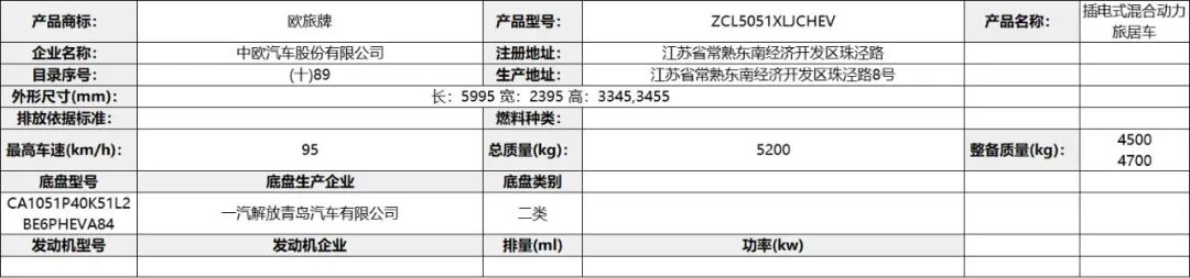该产品是新能源车辆,类型为插电式混合动力。储能装置种类/生产企业:锰酸锂蓄电池/天津荣盛盟固利新能源科技有限公司。该产品允许外接充电。驱动电机类型为永磁同步电机,驱动电机型号为TZ180XS016A,额定功率40kW,峰值功率为60kW,生产企业为中车株洲电机有限公司。该车专用装置由卧具、餐具、卫生设施、座椅等组成,是用于旅居的专用车辆;车辆侧、后防护均采用裙边结构,后防护离地高420mm;ABS防抱死制动系统生产厂家/型号:浙江万安科技股份有限公司/VIE ABS-II。