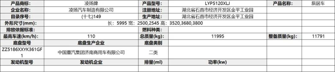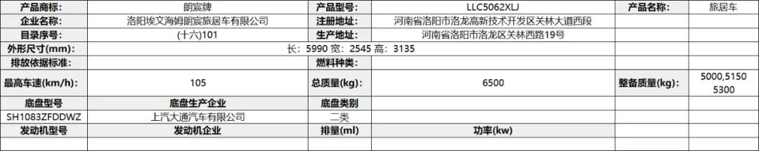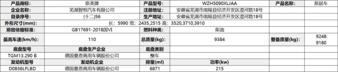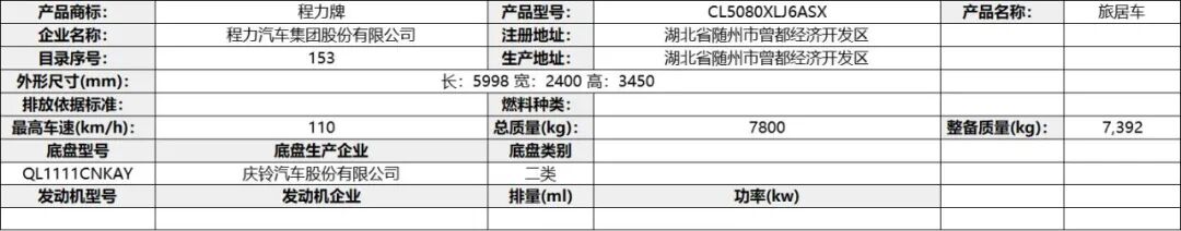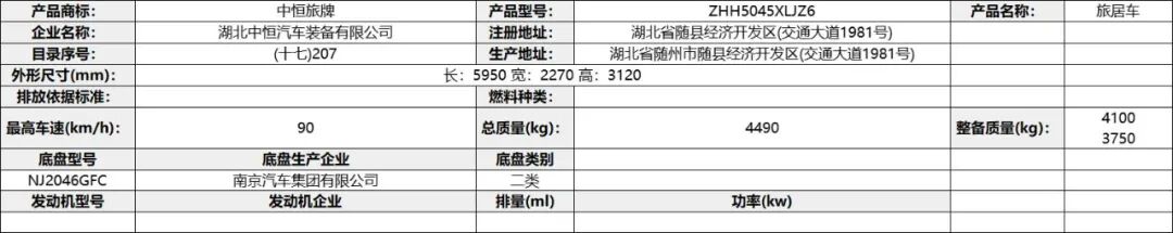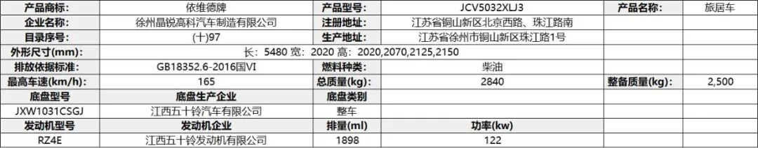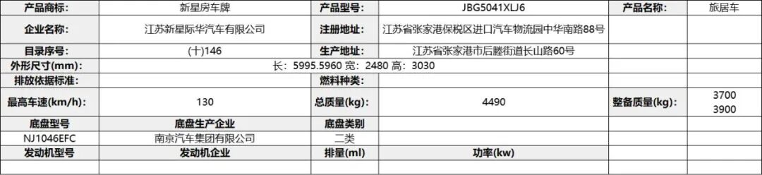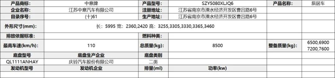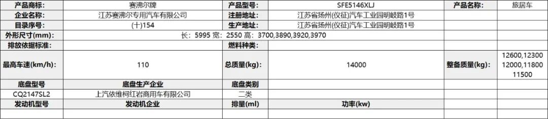 专用功能及装置:该车配备冰箱、卧具、厨具、卫生设施等旅居生活设施,用于旅行宿营;仅使用驾驶室后围有贯通开口、轴距3308mm的底盘改装;ABS 型号VIE ABS-Ⅱ,生产企业:浙江万安科技股份有限公司,型号CM4XL-4S/4M,生产企业:广州瑞立科密汽车电子股份有限公司。发动机最大净功率为:SC28R150Q6/107.5kw;D30TCIF1/120kw;选装描述:选装高配时对应整备质量为5300kg,选装中配时对应整备质量为5150kg,选装简配时对应整备质量为5000kg。该车辆允许牵引挂车,其准拖挂车总质量为3500kg,牵引杆深入量60mm,最大负荷200Kg。