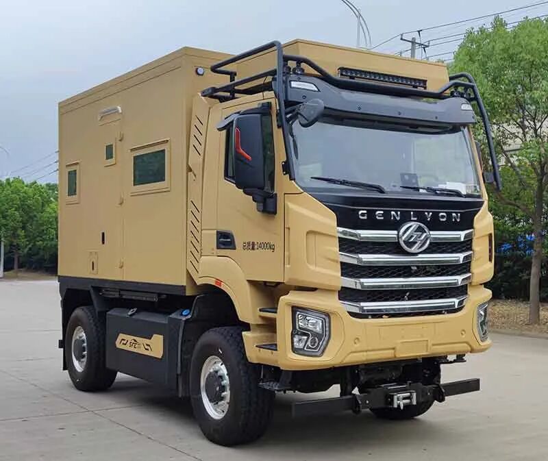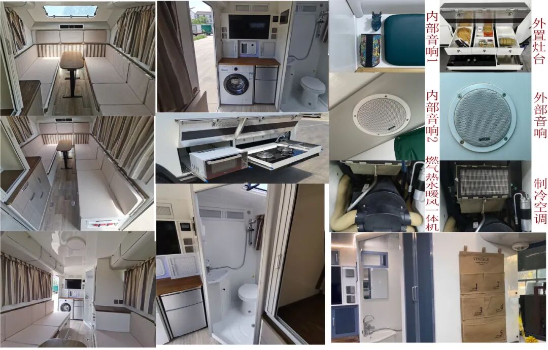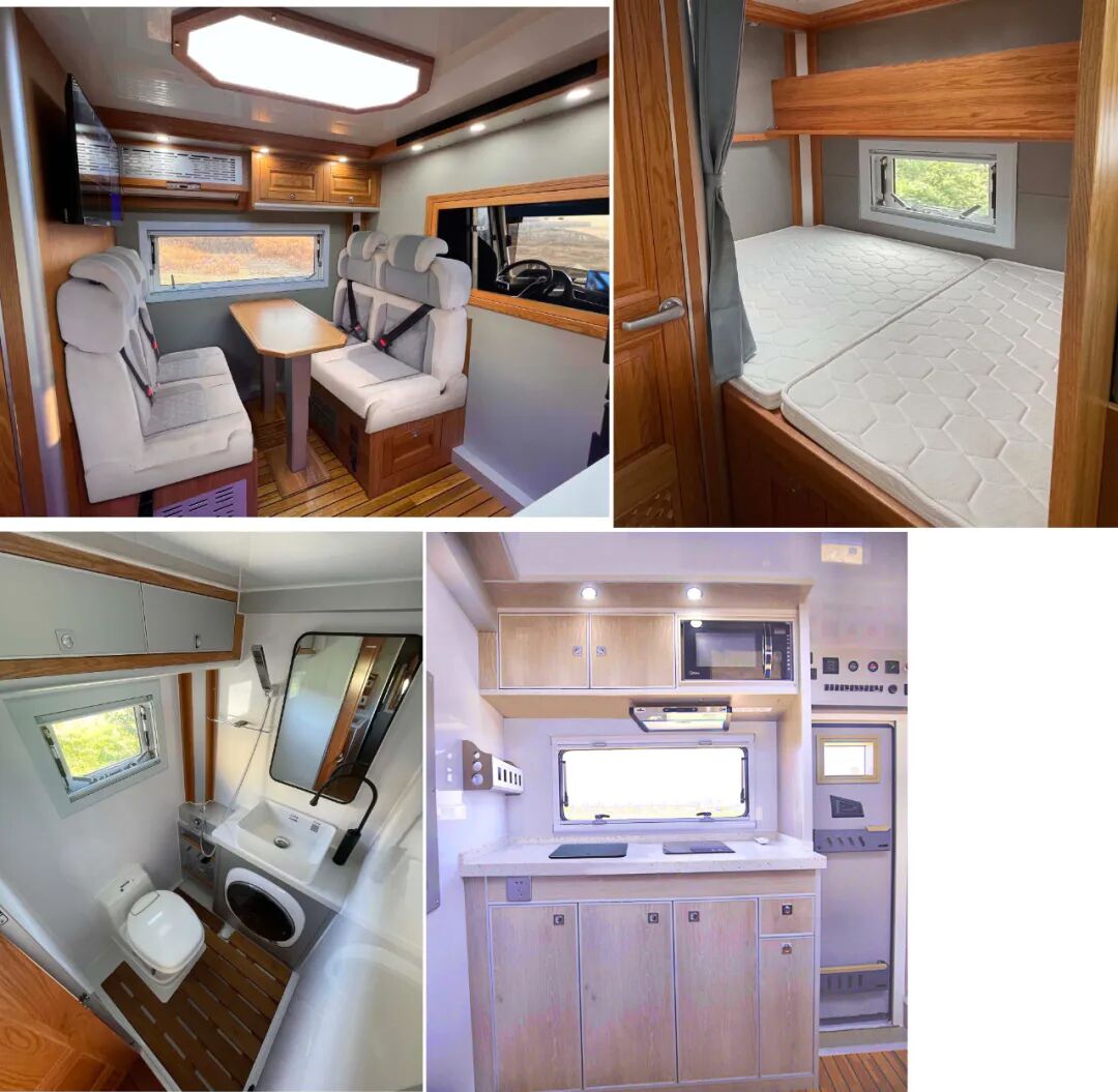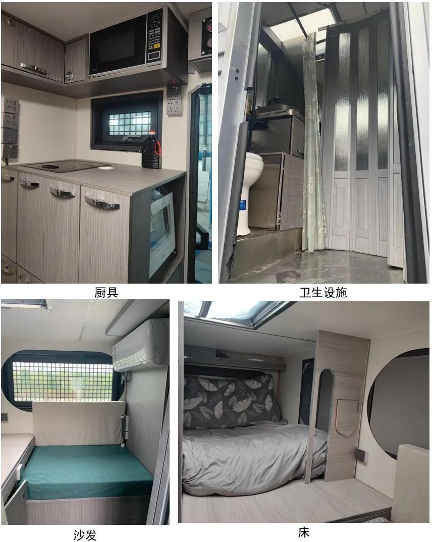 车辆配备卧具、卫生设施、电气设施等旅居生活设施和旅行宿营的专用装置,设施固定方式为螺栓安装,配备烟雾和气体报警装置及应急逃生口。选装不同风格的内饰颜色和设备布局,选装不同车顶空调高度有变化,选装不同遮阳棚对应整车宽度有变化,车厢两侧均可开散热格栅和仪器舱门, 侧防护为裙板结构,材质为超高强度铝合金,离地高度为480mm;后防护为钢质,截面高度直径133mm,离地高度为405mm,连接方式为:螺接;车头灯具为选装,供人员在野外非道路状况下工作和生活照明使用,配备厨具,卧具,卫生设施等旅居生活设施和娱乐设施等专用装置;可随车携带必备物品,骑行装备等,在野外非道路状态下可升顶。