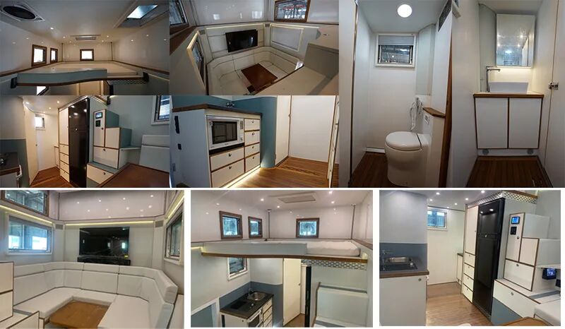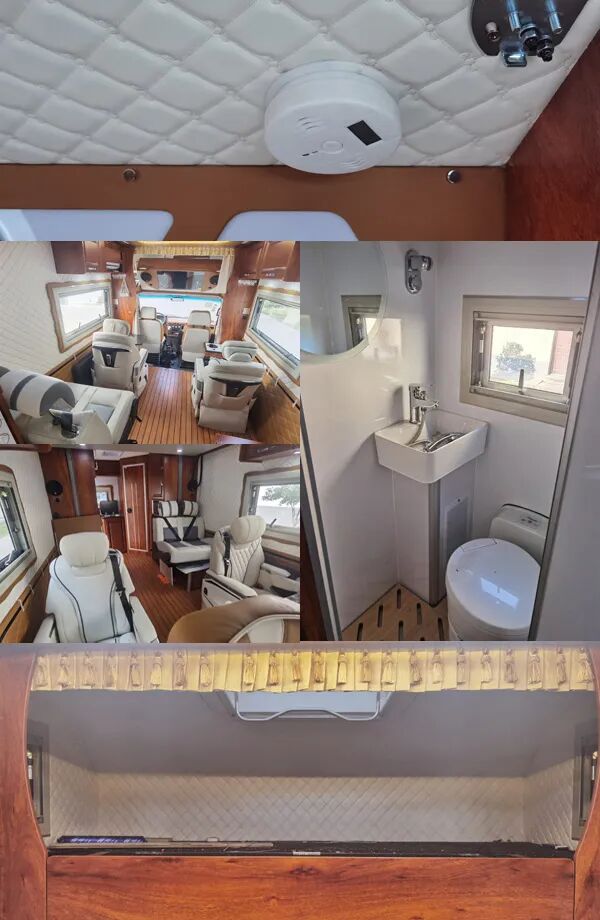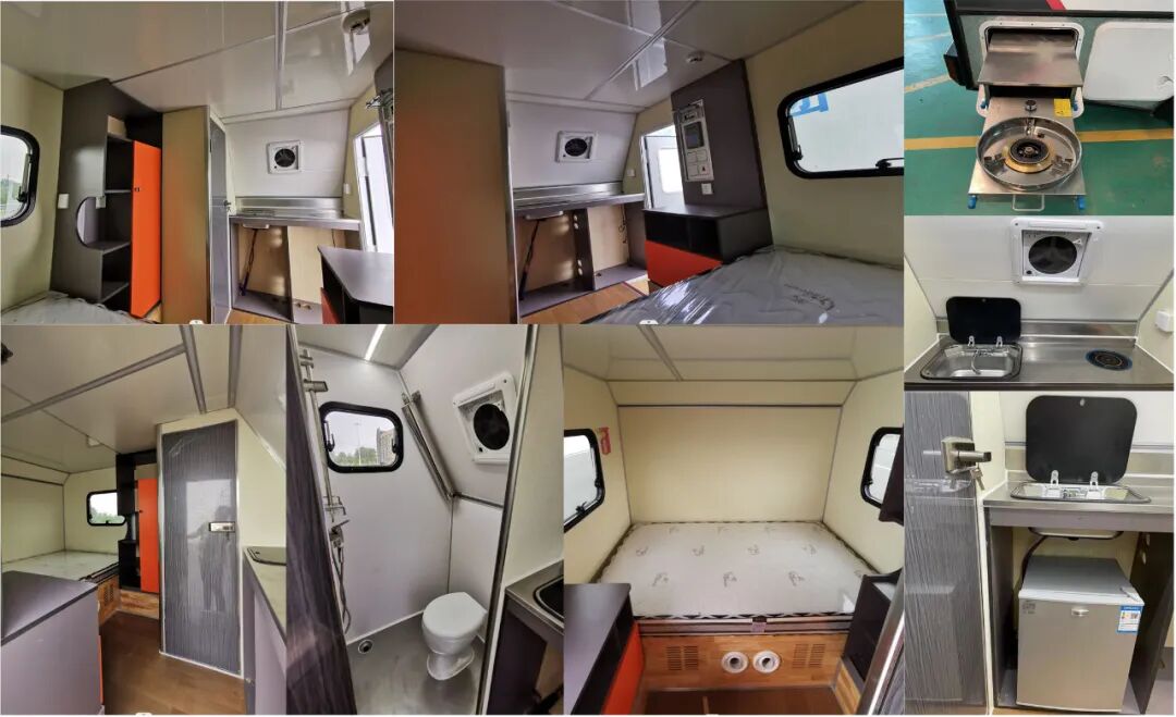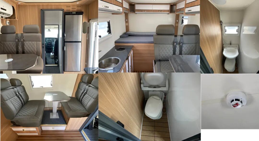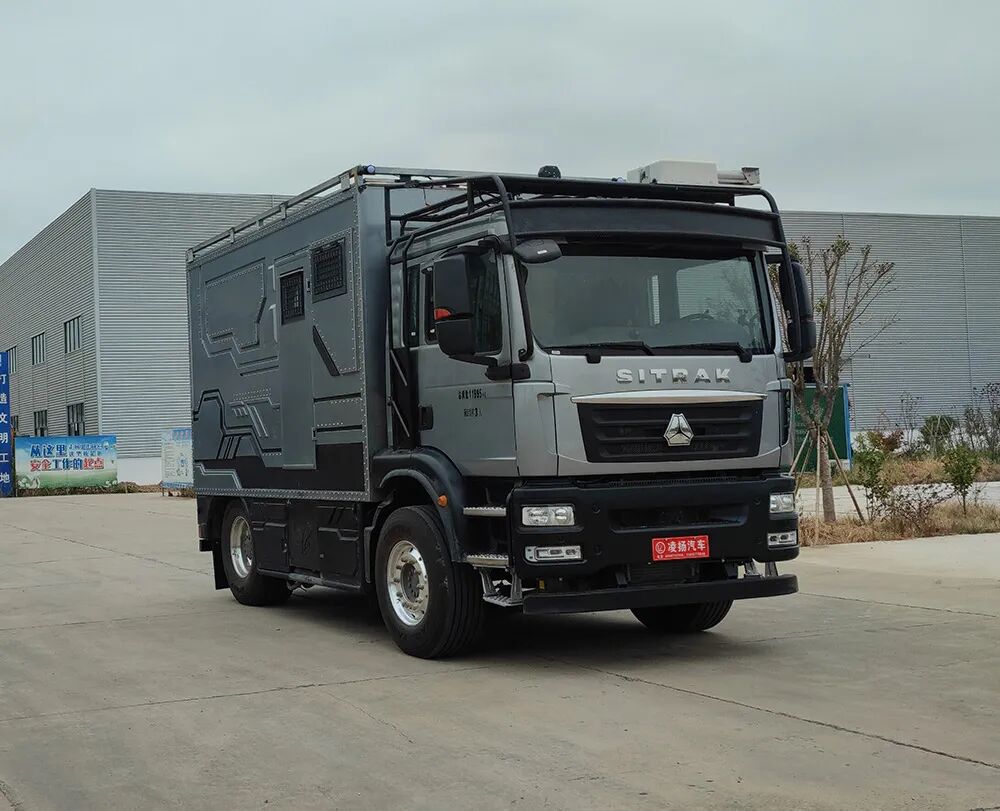 车辆配备卧具、卫生设施、电气设施等旅居生活设施和旅行宿营的专用装置,设施固定方式为螺栓安装,配备烟雾和气体报警装置及应急逃生口。选装不同风格的内饰颜色和设备布局,选装不同车顶空调高度有变化,选装不同遮阳棚对应整车宽度有变化,车厢两侧均可开散热格栅和仪器舱门, 侧防护为裙板结构,材质为超高强度铝合金,离地高度为480mm;后防护为钢质,截面高度直径133mm,离地高度为405mm,连接方式为:螺接;车头灯具为选装,供人员在野外非道路状况下工作和生活照明使用,配备厨具,卧具,卫生设施等旅居生活设施和娱乐设施等专用装置;可随车携带必备物品,骑行装备等,在野外非道路状态下可升顶。