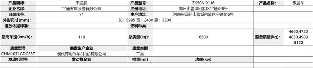 专用装置及功能:车内设有桌椅,睡具,炊具,卫生设施及照明和空气调节等设施,用于旅行宿营;该车左右侧防护为裙边结构,后防护装置所用材料:Q235,后防护装置与车体采用焊接连接;后部防护装置的断面尺寸100mm×50mm,后防护装置离地高度480mm;发动机最大净功率93kW。ABS系统控制器型号:3550A500,ABS系统控制器生产企业:浙江亚太机电股份有限公司。可选装直接供电式ETC装置;前悬架形式为:双摆臂扭杆独立式。