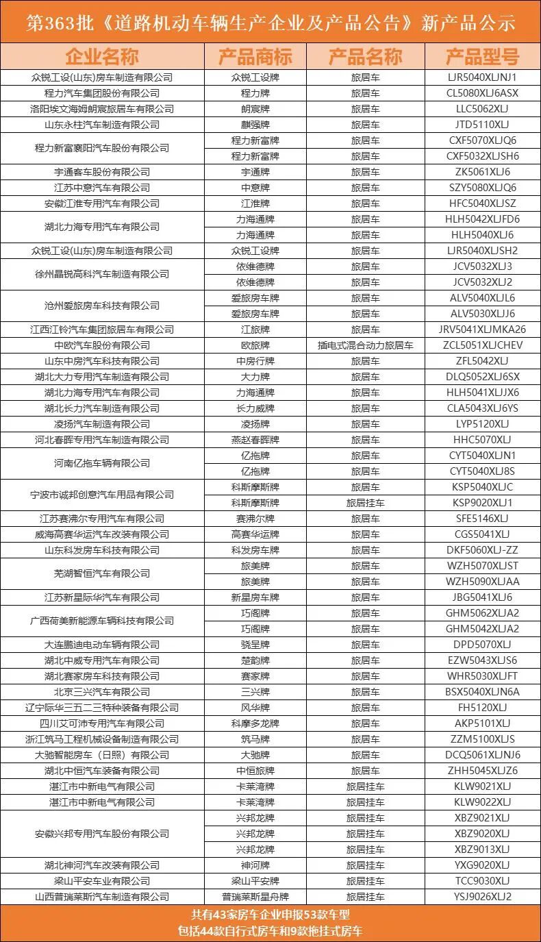 2022年10月14日,国家工业和信息化部在官方网站公示了363批关于《道路机动车辆生产企业及产品公告》(以下简称《公告》)新产品,共有43家房车企业申报53款车型,包括44款自行式房车和9款拖挂式房车,其中宇通、朗宸申报首款轻卡房车,赛沸尔申报首款重卡房车,还有一款新能源房车;申报车型种类上,轻卡、重卡房车占比明显增多。