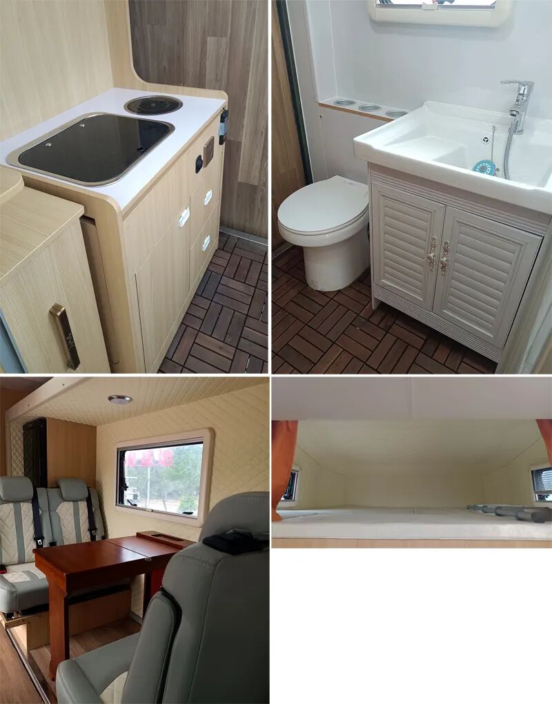 样车加装天窗及换气扇,车高2150mm,车顶可选装顶天窗加太阳能板加换气扇、选装换气扇、选装太阳能板加换气扇,车高2150mm,车顶不选装设备高度2020mm,选装天窗或天窗加太阳能板车高2125mm,选装太阳能板车高2070mm。牵引连接装置接口(准拖挂车总质量为2800kg),牵引挂车时,中置轴挂车的牵引杆深入量为50mm,中置轴牵引杆连接器最大负荷为120kg。牵引连接装置接口可不选装,不影响整车长度。专用装置为桌椅、睡具、电磁炉、卫生设施。该车升顶时不可行驶,升顶时可使用卧铺。该车选装ETC车载装置。
