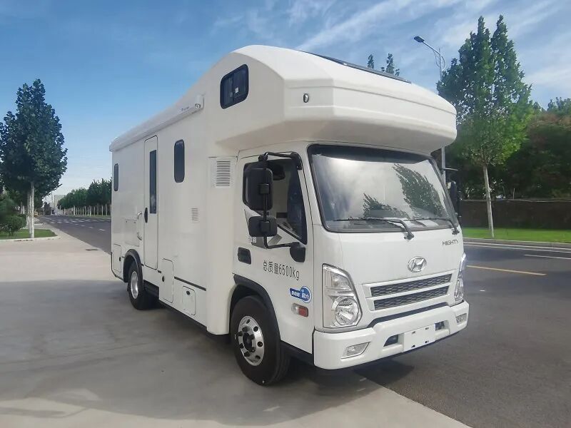 本车型装备桌椅、睡具、卫生设施、厨房设施等,用于宿营旅居;随底盘选装前组合灯,选装前轴轮眉结构,选装前下防护结构,选装上车扶手,驾驶室外观造型,选装不同的车顶结构或车顶选装不同设备时可引起车身高度发生变化,车顶可选装空调、换气扇、天窗、卫星天线、太阳能板,右侧可装扶手、不同型式乘客门,左右两侧均可选装遮阳篷;侧防护材质为5052铝合金,连接方式为螺栓连接,后防护材质为Q235,后防护下边缘离地高度470mm,连接方式为焊接。