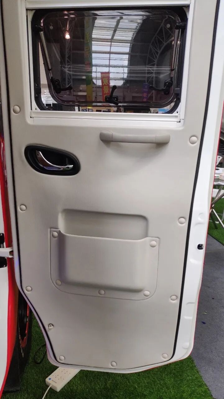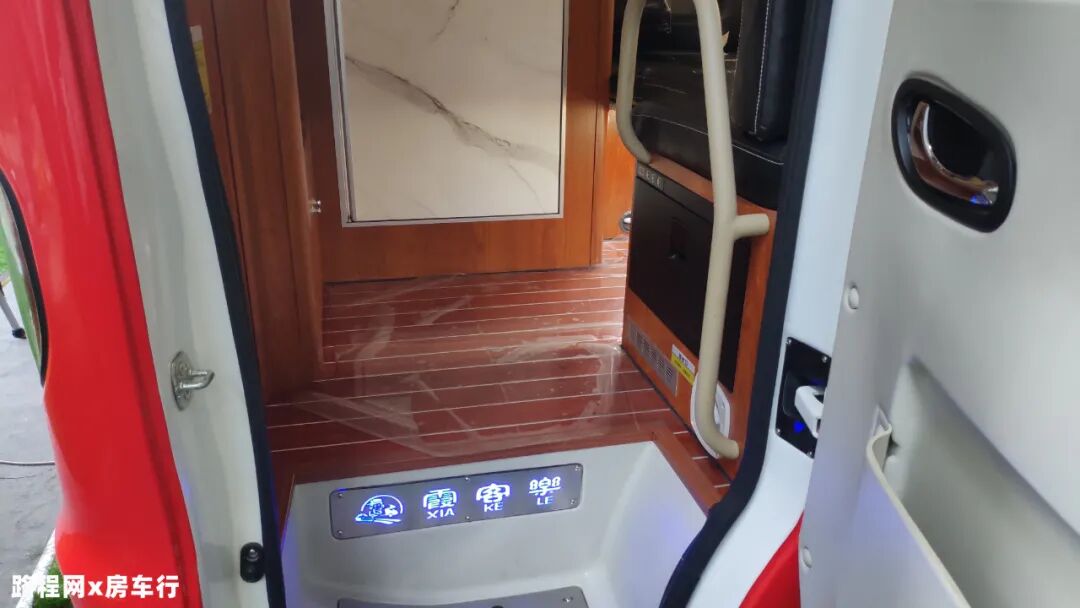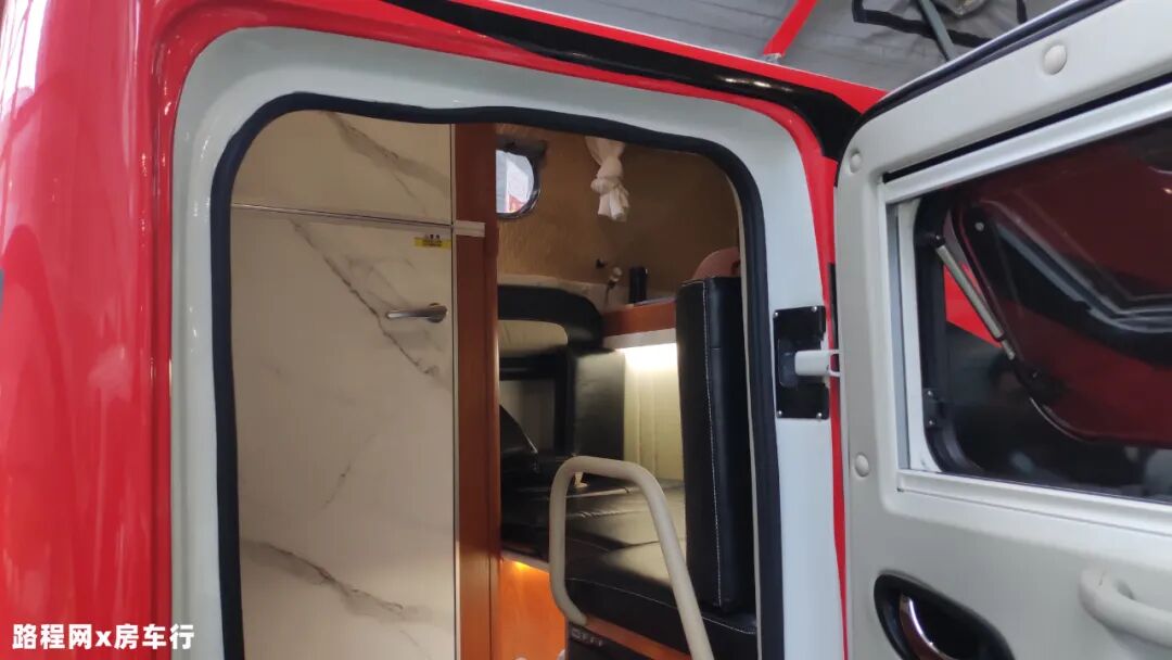 车门底部设有踏步,侧方设有上车扶手方便日常上下生活区;此外,进门右手处下方的位置(扶手下方)还设有一台隐藏式房车专用30L冰箱;
