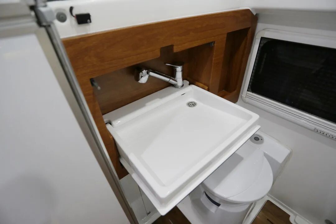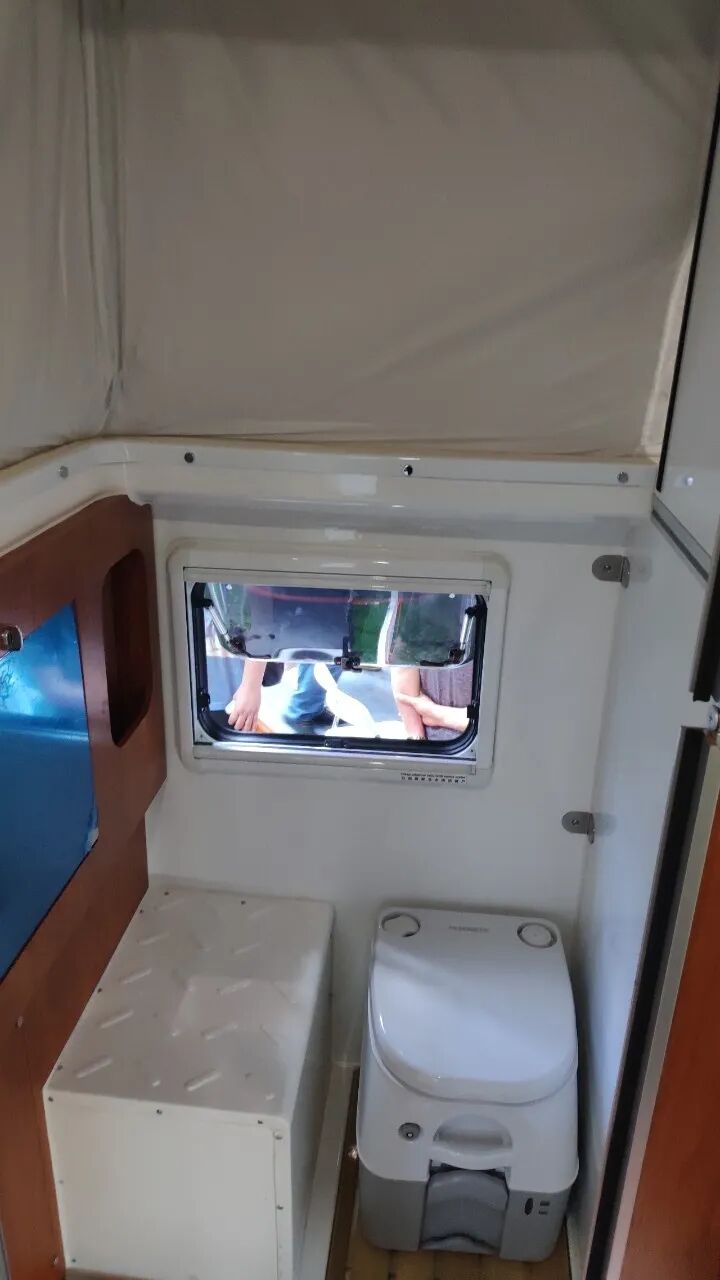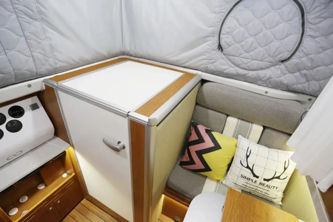 升顶后的卫浴间内部空间尚可,内部配置了折叠式洗漱池(内含抽拉式淋浴花洒)与多美达便携式马桶,在实际使用过程中互不干扰,洗漱池不使用时可折叠隐藏,便携式马桶在不使用时也可以放置到别处,增加内部空间的使用面积;