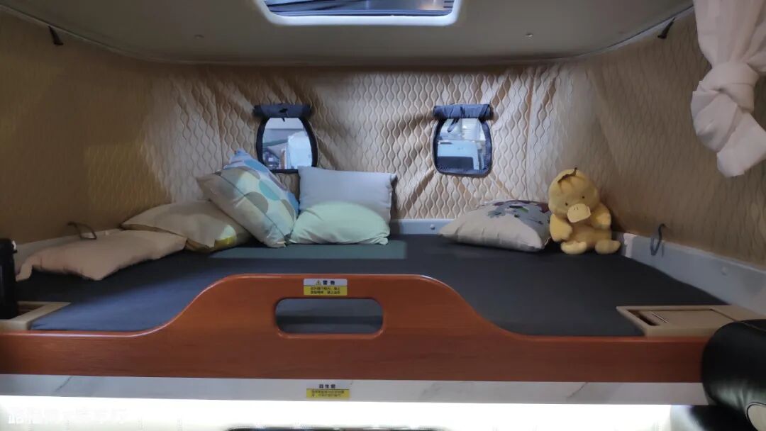 升顶后的驾驶舱上方设有一张豪华双人床,内部空间充足,可满足夜间多人睡眠的需求;双人床侧方设有防护栏防止跌落;上方设有顶置天窗、头部设有两个小窗户方便日常采光、通风;