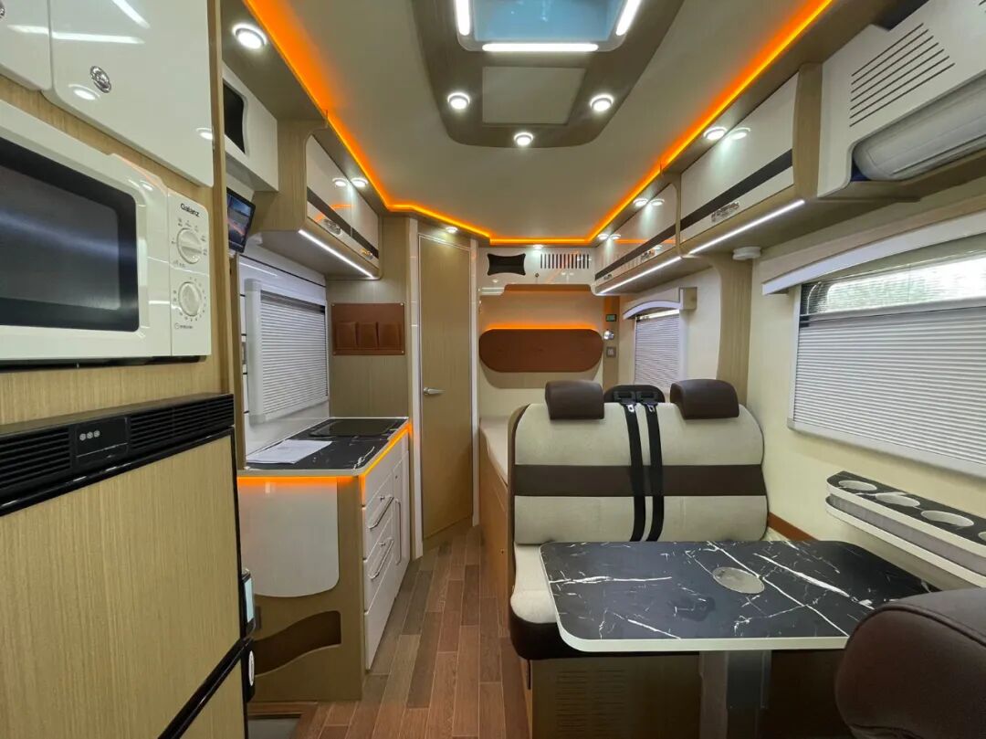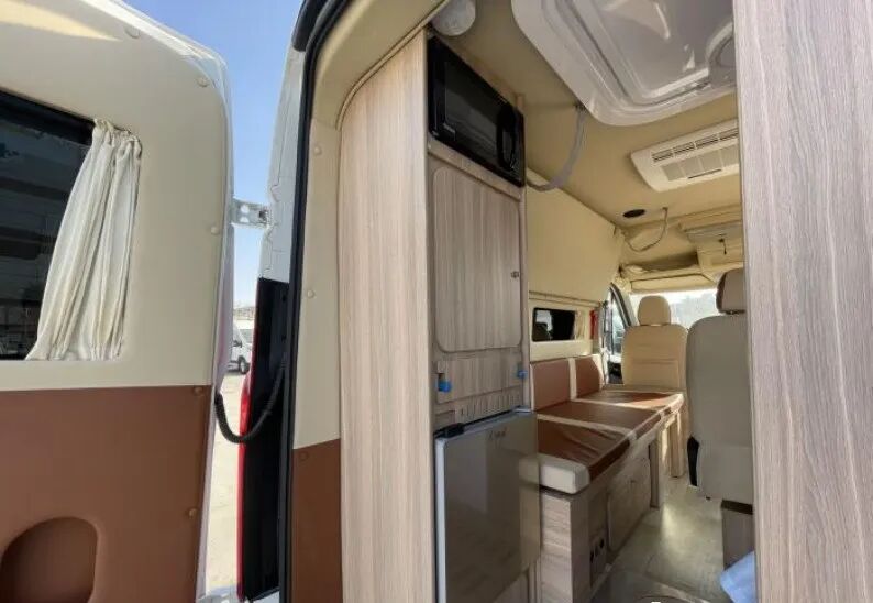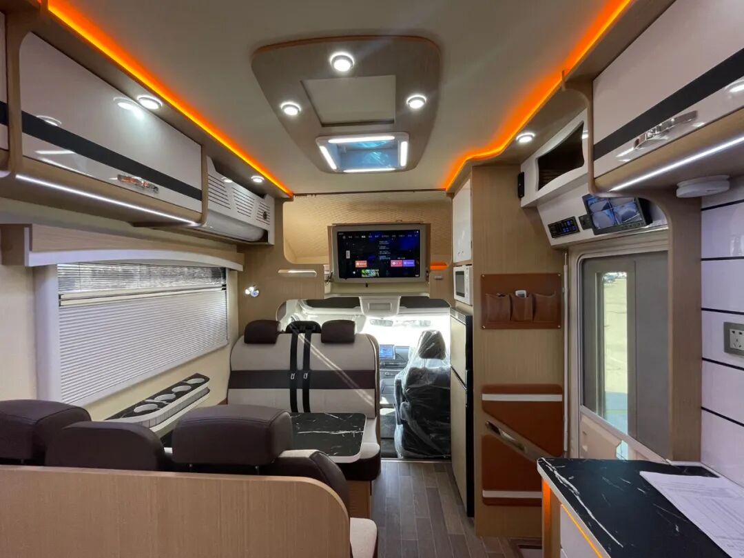 内饰设计简约素雅,旅行居住温馨舒适;双人卡座设计的会客厅,乘坐舒适,满足日常乘坐休息;尾部大尺寸纵床空间宽敞,解决户外旅行睡眠的需求。