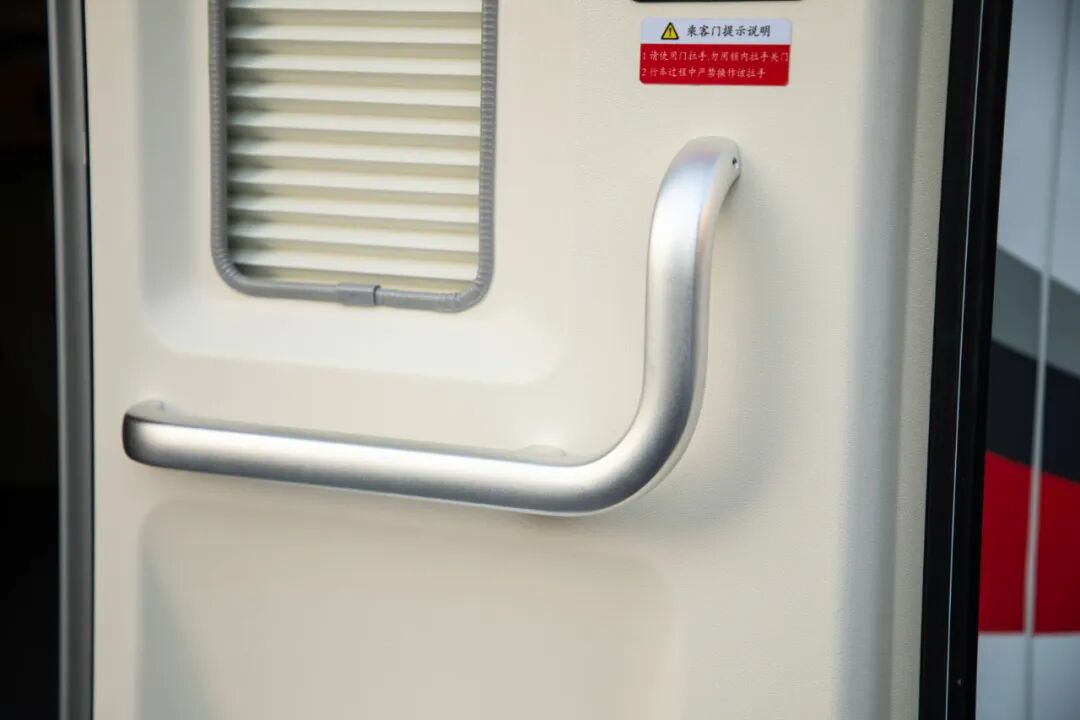 同时乘客门带有上下扶手和电动伸缩踏步,设计非常贴心,在细节设计上考虑了不同年龄群体,对于老年人和小孩子很友好。