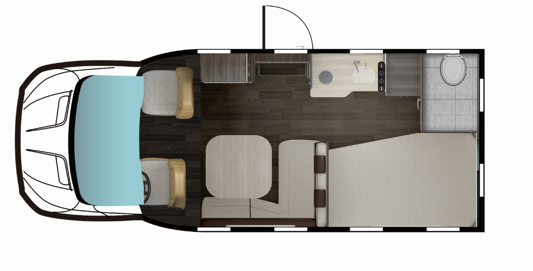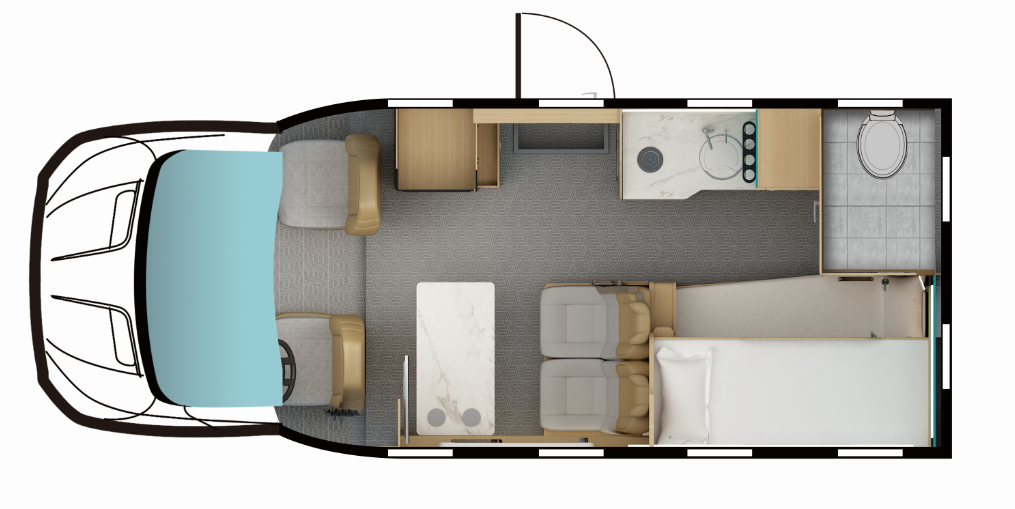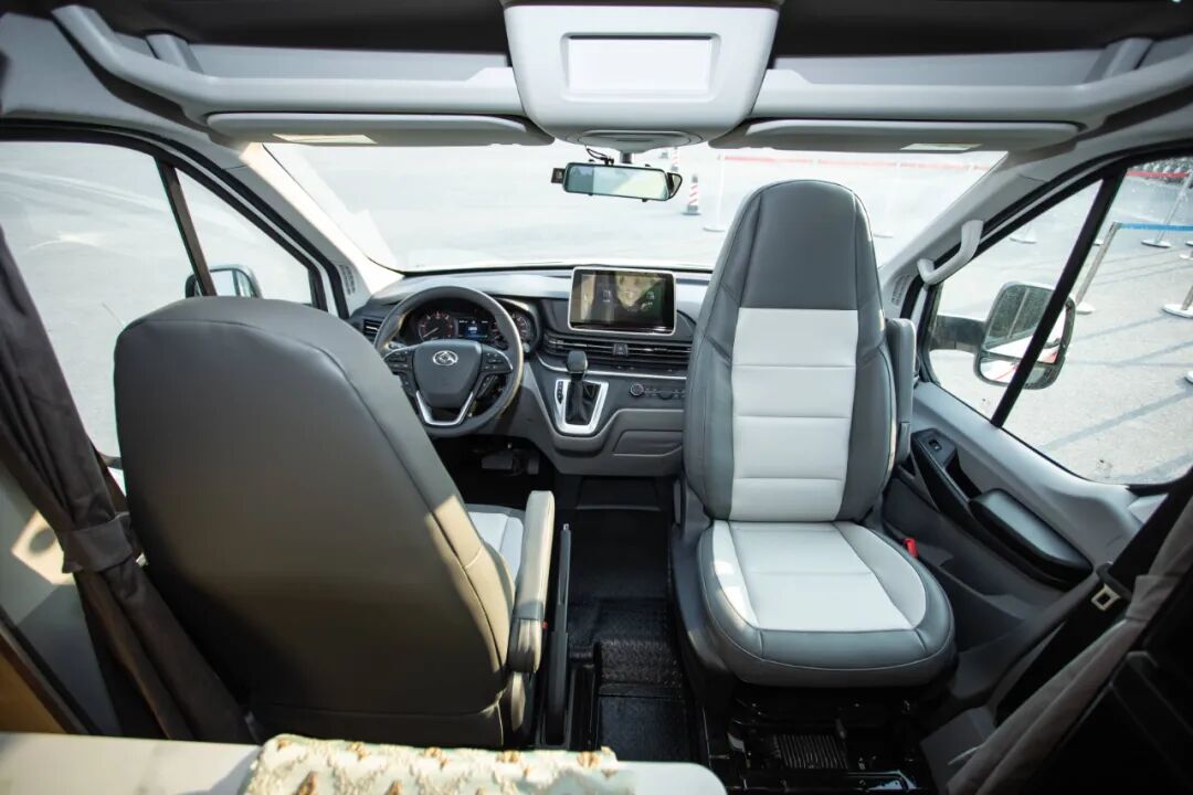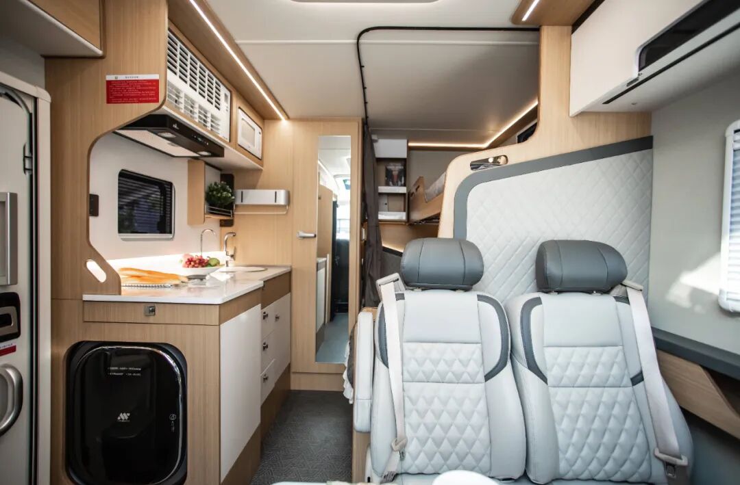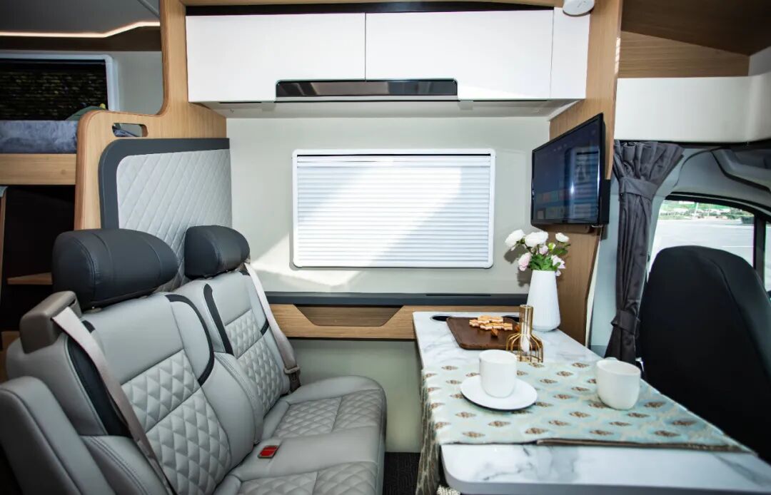 接下来我们了解它的内部布局,这款车有两款布局可供大家选择,分别是双人商务座椅布局、L型卡座布局。这次为大家带来的是双人商务座椅布局,整车生活区的规划非常合理,从前往后依次设立了驾驶舱、会客区、厨卫区、休息区,足以满足人们日常生活。