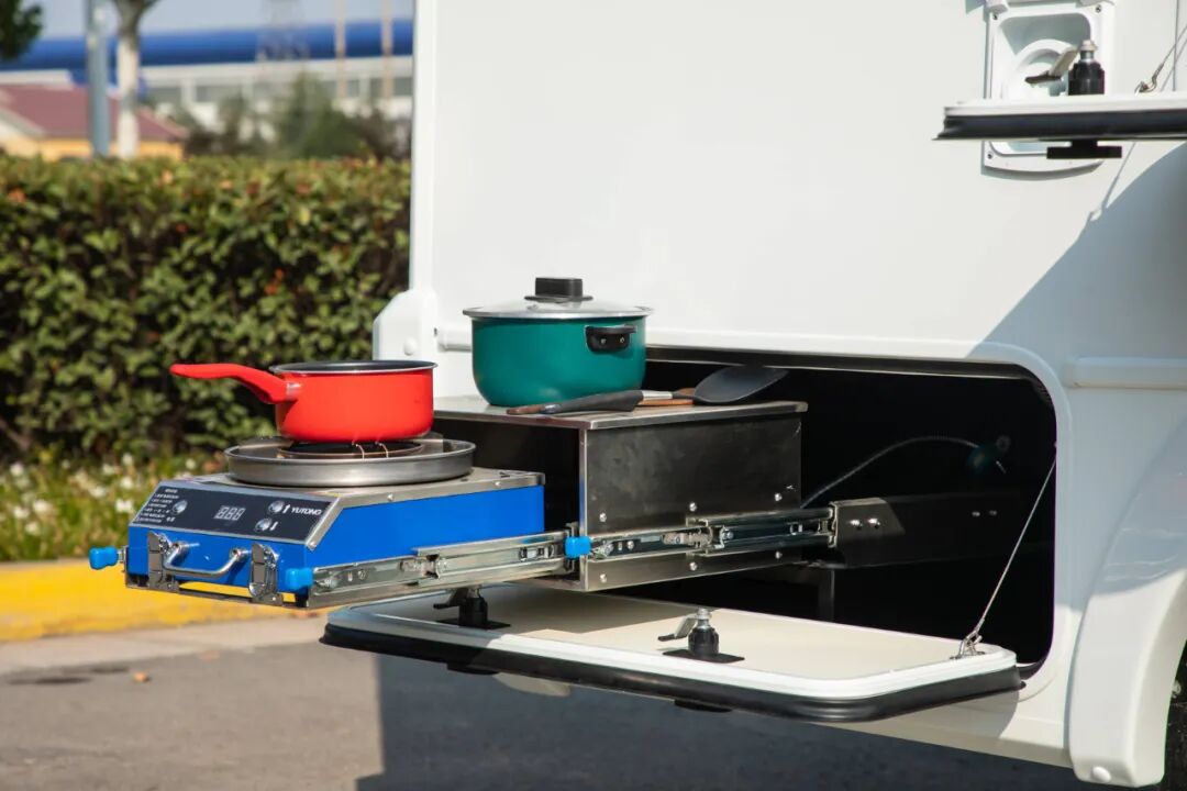 车身外部配置了进口遮阳篷(选装)、储物舱、户外厨房、新能源充电口、注水口等设施,以及1300W便携式电磁炉,节省空间的同时,在车外做饭也避免了车内做饭油烟重的问题,还有野炊的乐趣。