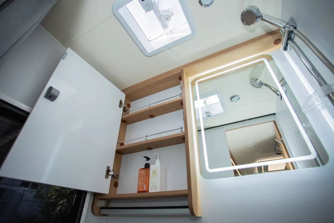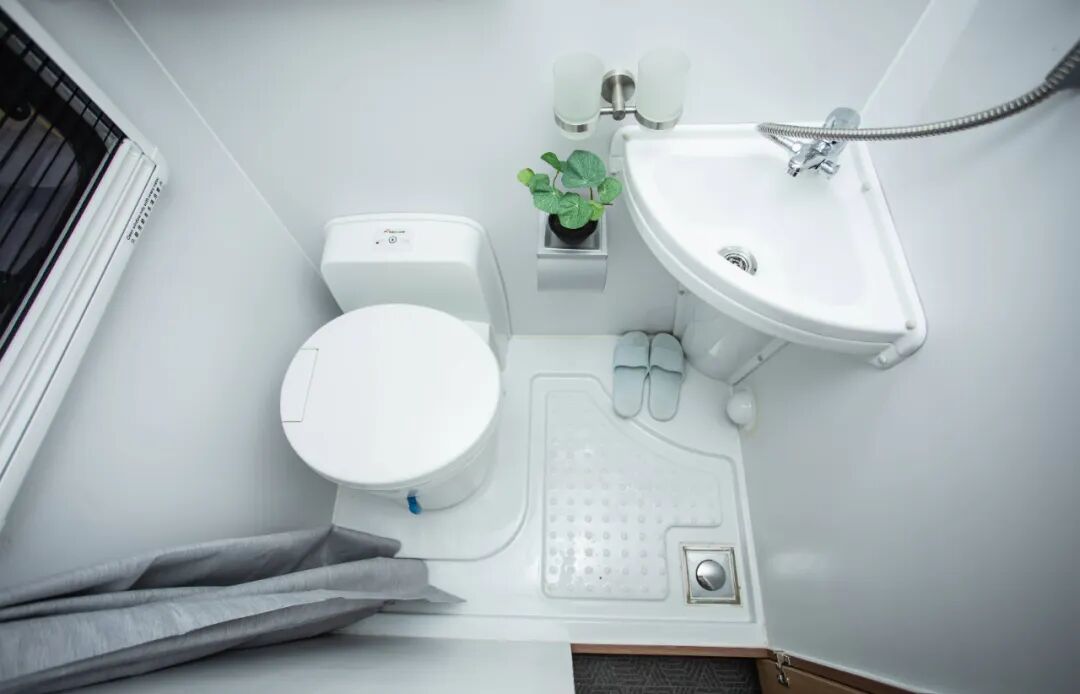 卫生间位于车尾部分,内部配置了淋浴花洒、浴室镜、吊柜、浴室帘、洗手盆、可旋转马桶等设施,可满足车上人员的日常洗漱需求;头顶双向换气扇保证了卫生间的空气流通。