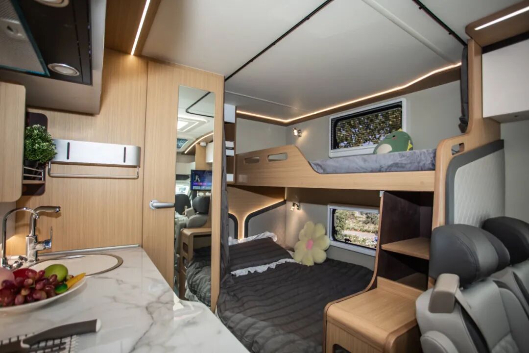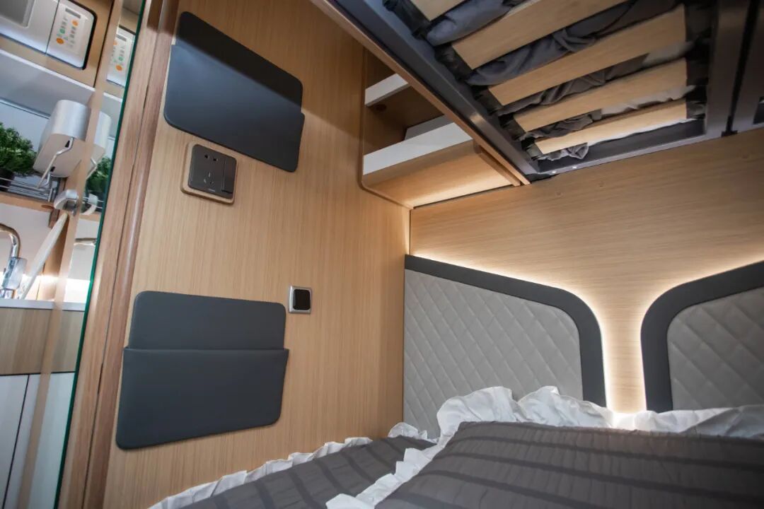 固定休息区在车尾另一侧,纵置上下铺,均配有加厚床垫,保证睡觉的舒适性;上下层都有中空亚克力外推窗,能够保证通风、采光的需求。同时还设有储物柜、床头灯、充电口等便利性设施,为车上生活增加了便捷性。