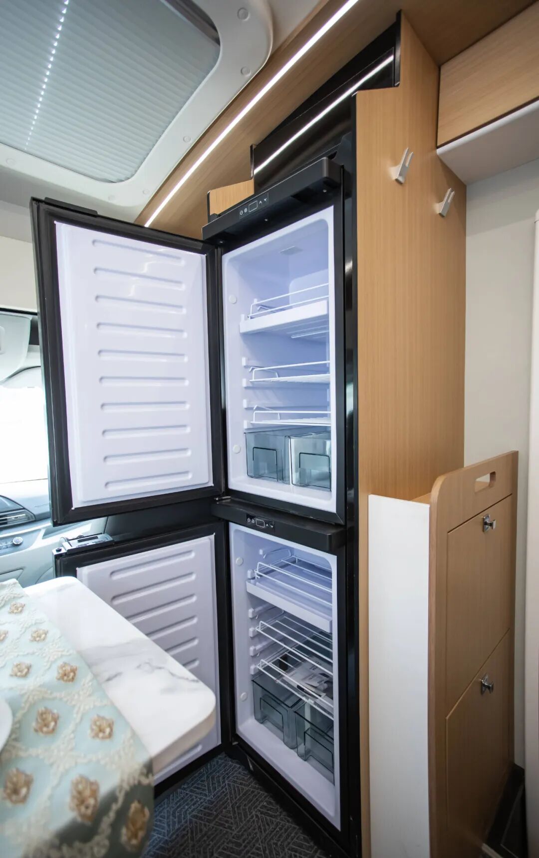 会客区旁边是一台房车专用双开门148L冰箱(冷冻48L、冷藏100L),日常可以放些瓜果蔬菜和冷冻食品,满足不同食物的存放条件。