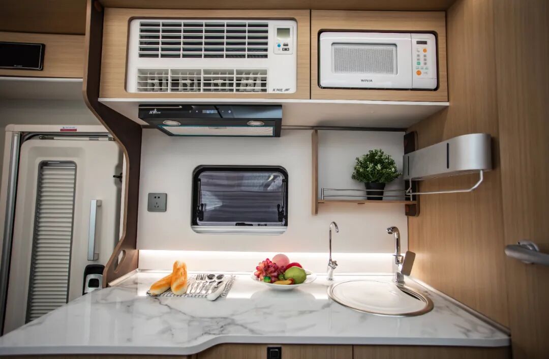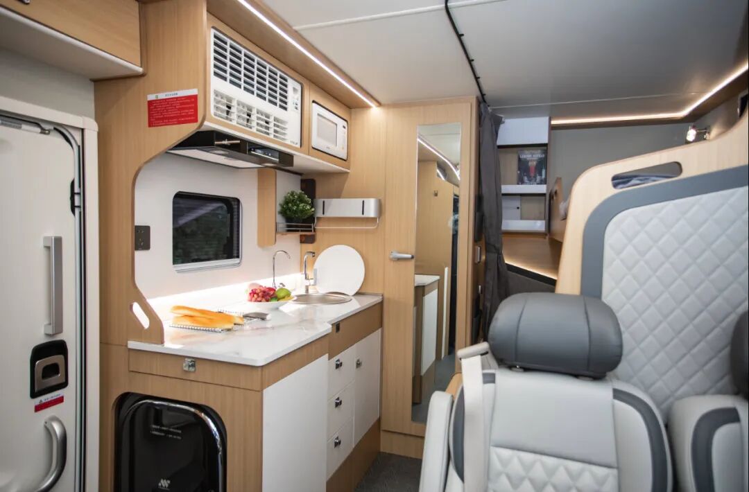 厨房是在会客区侧后方,一体式橱柜,C型房车同级别最长的操作台面(1280+400mm扩展),可以轻松摆放全套厨具。带有饮用水装置、微波炉、油烟机等,设施一应俱全。如果遇到不适合车外做饭的情况,还可以将便携式电磁炉搬进来,在车内做饭,油烟机+中亚克力外推窗可以大幅缓解油烟问题。