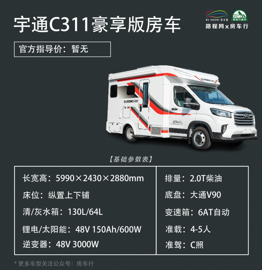 宇通C311豪享版房车基于大通V90底盘打造,动力搭载2.0T柴油发动机,传动系统匹配6速自动变速箱方便驾驶;整车车身外尺寸为5990x2430x2880mm,小额头的设计方便出行,通过性更强;整车核载4-5人,很适合家庭出行;车身外部使用的是高光玻璃钢,更有光泽度,也便于清洗,搭配彩色拉花非常吸睛,整体上扬的形态,给人以扶摇直上九万里之势。