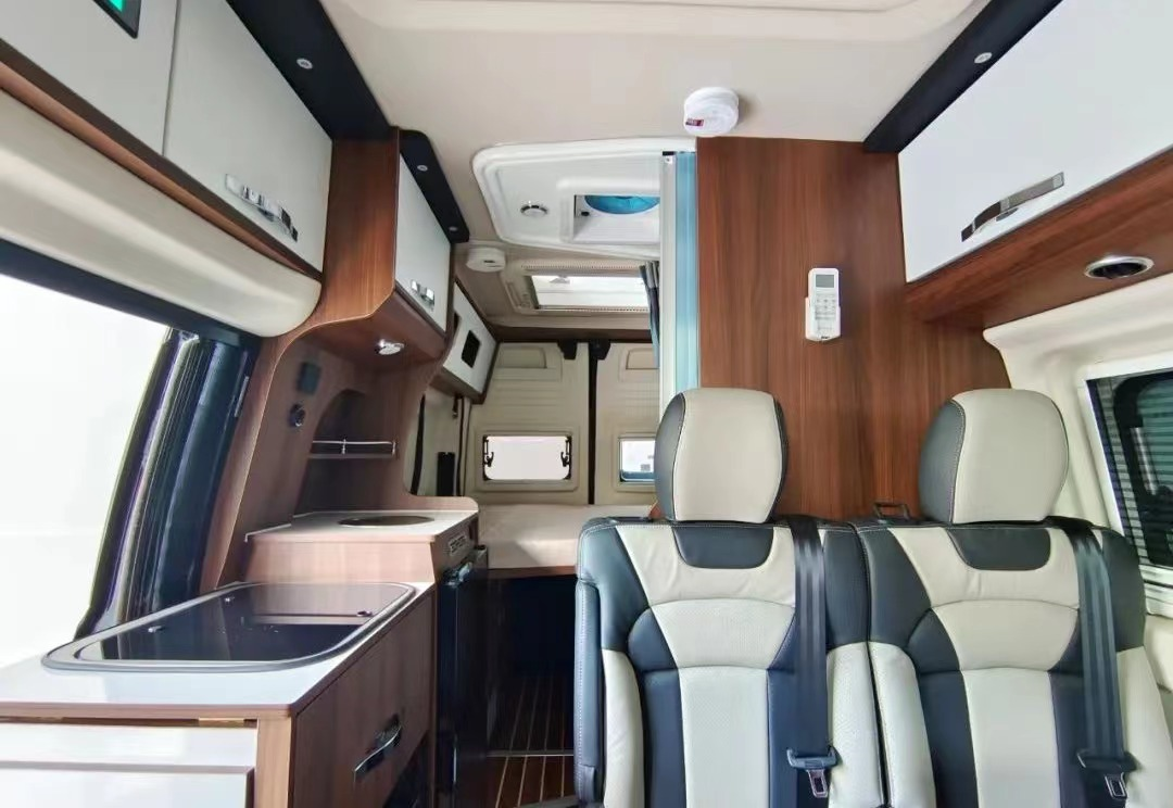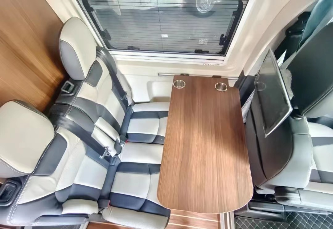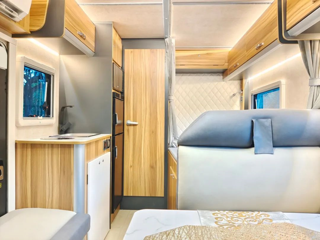 车辆内部功能区明确,主要分为驾驶室、额头床、会客区、厨房区、卫浴间和尾部休息区共计六大部分。整体内饰采用原木色风格设计,搭配暖色照明系统+氛围灯,更有居家的感觉;家具采用板式轻量化板材+进口LG专用地板革,环保耐用;额头休息区设有大空间双人床,尺寸为2000x1300mm,尾部休息区纵置一张2000x1200mm床铺,满足日常睡眠休息所需。