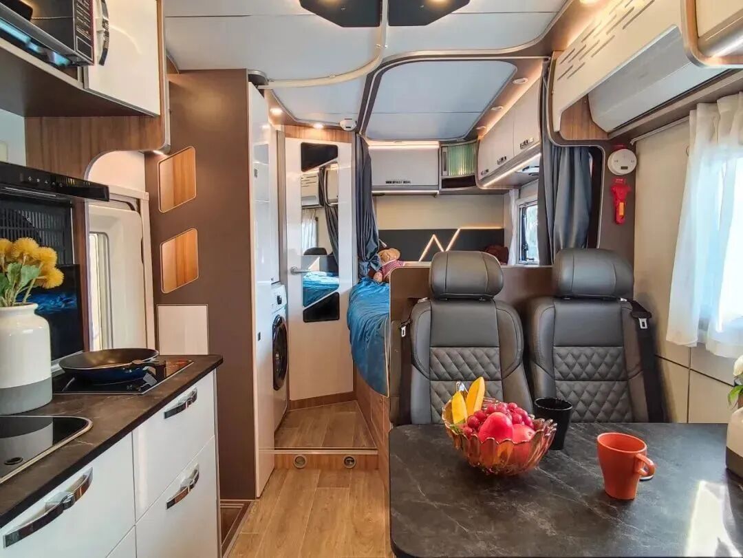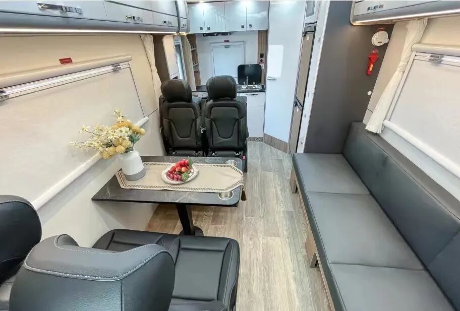 生活区采用额头床+L型卡座+室内厨房+尾纵床+卫浴区的经典大空间布局,乘坐、休息空间丰富,足以解决一家人外出旅行休息的问题;E0级环保家具组合,搭配进口房车专用地板革,打造绿色健康、轻奢舒适的旅居生活氛围。