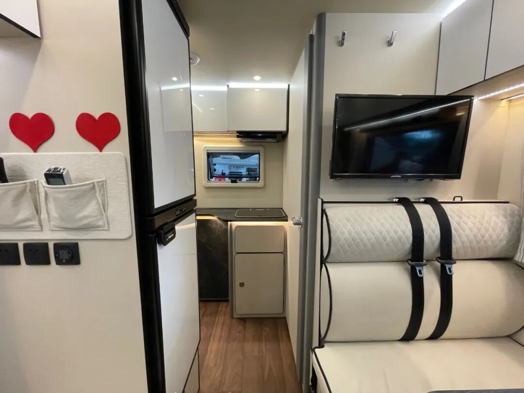 进门左侧就是厨房区,厨房下方提供了一个大尺寸的拓展板,有效的增加了操作台的实用面积,还配备了抽油烟机、洗菜池、房车专用冰箱等,轻松满足日常烹饪的各种需求。