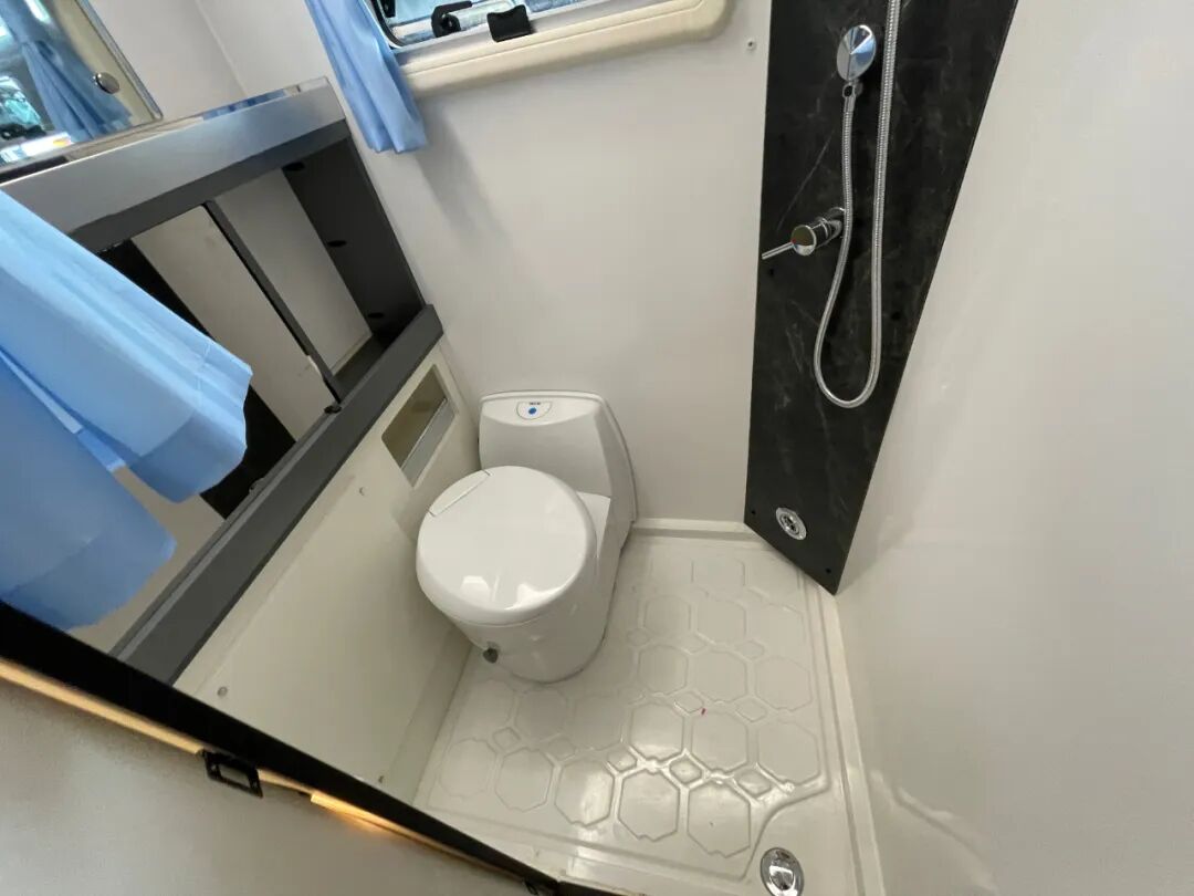 卫浴区在厨房区的旁侧,内部采用的折叠水盆的设计,折叠收放,便携不占空间,基础设施配备了盒式马桶、独立淋浴花洒、换气扇等,设施一应俱全。
