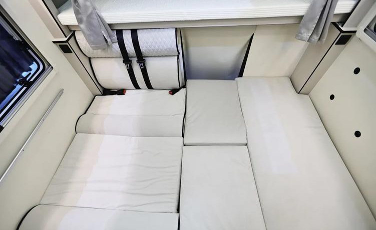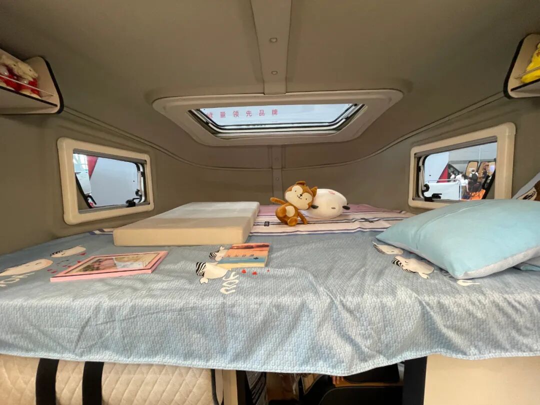 自由炮C配备了两张超大床铺,另一张就是位于驾驶室上方的超大额头床,尺寸达到了1.9mx1.7m,可满足三人休息睡眠需求,床铺做了三面环窗设计,通风采光效果极佳。