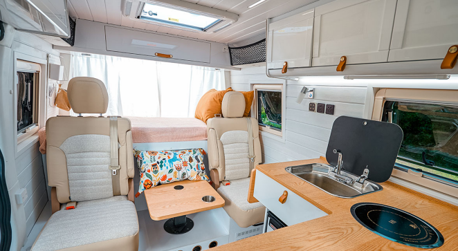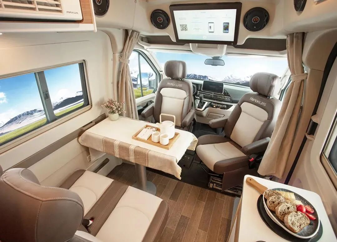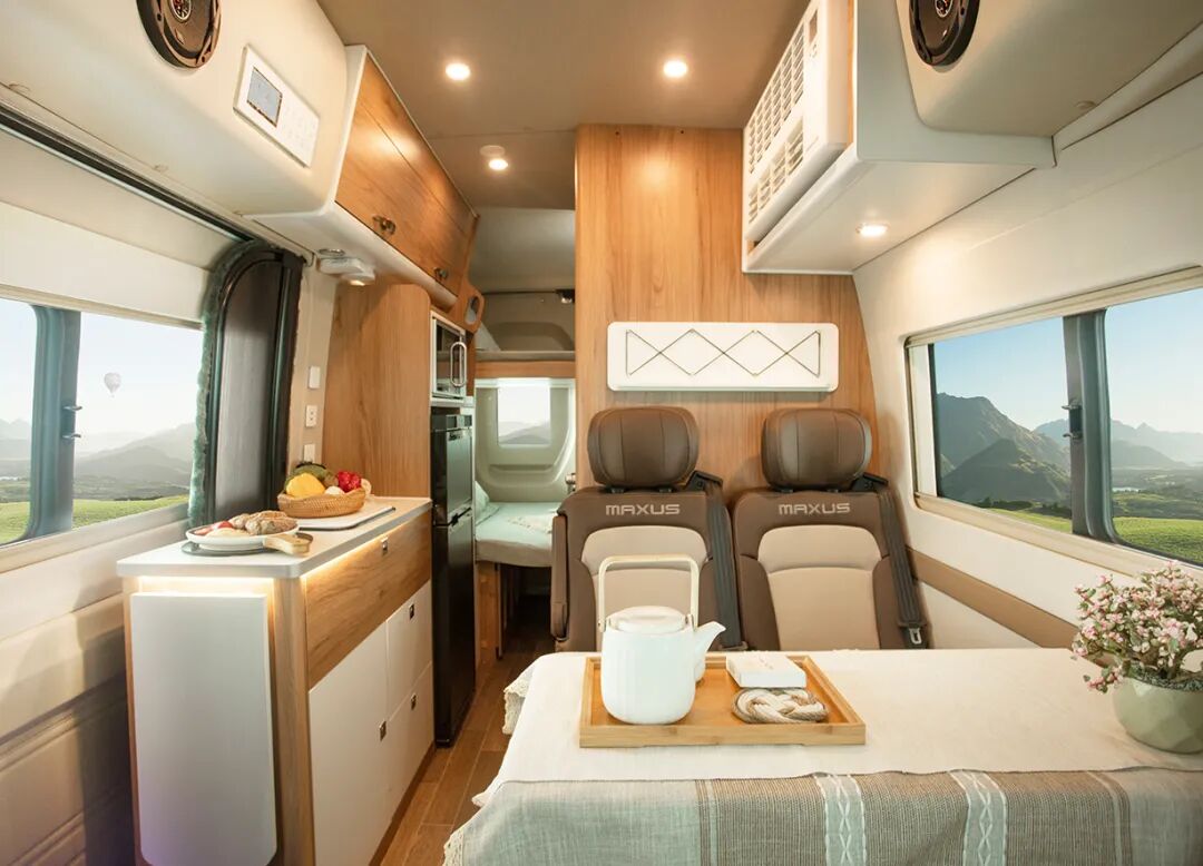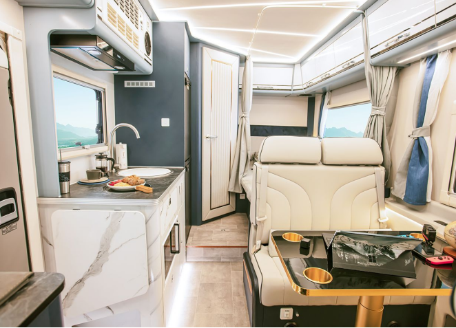 原厂房车专用依维柯底盘打造,F1C铂金动力3.0T涡轮增压柴油发动机,最大功率125kW,峰值扭矩400N.m,采埃孚8AT变速箱。博世ESP 9.3电子车身稳定系统、后驱后双胎、LDWS车道偏离预警、驻车安防四路监控,清水箱具备加热保温(柴暖)功能,驻车加热系统(暖风/热水),13.44kWh锂电,车内一体式橱柜,48V直流变频空调。