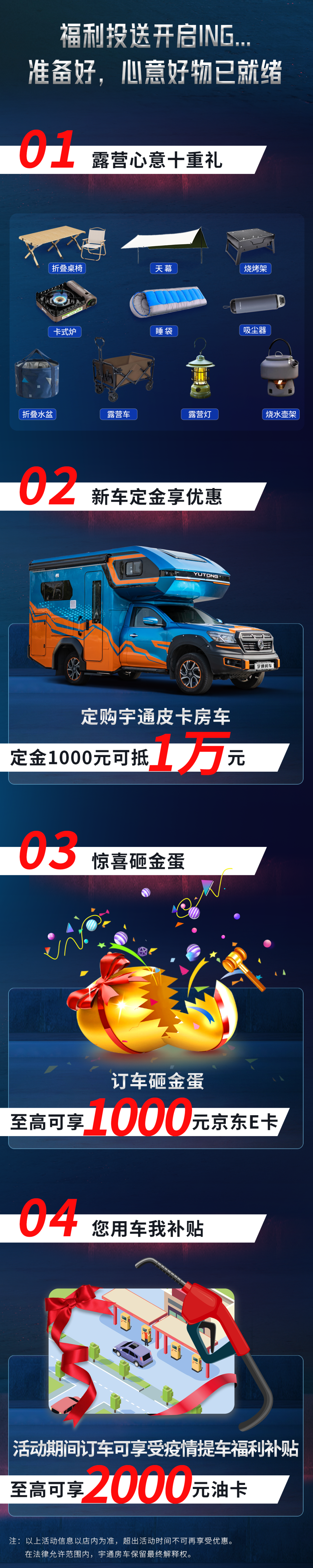 优惠政策:定购宇通皮卡房车享定金1000抵1万