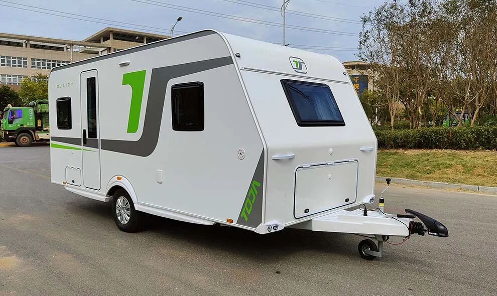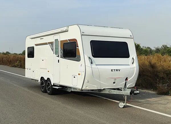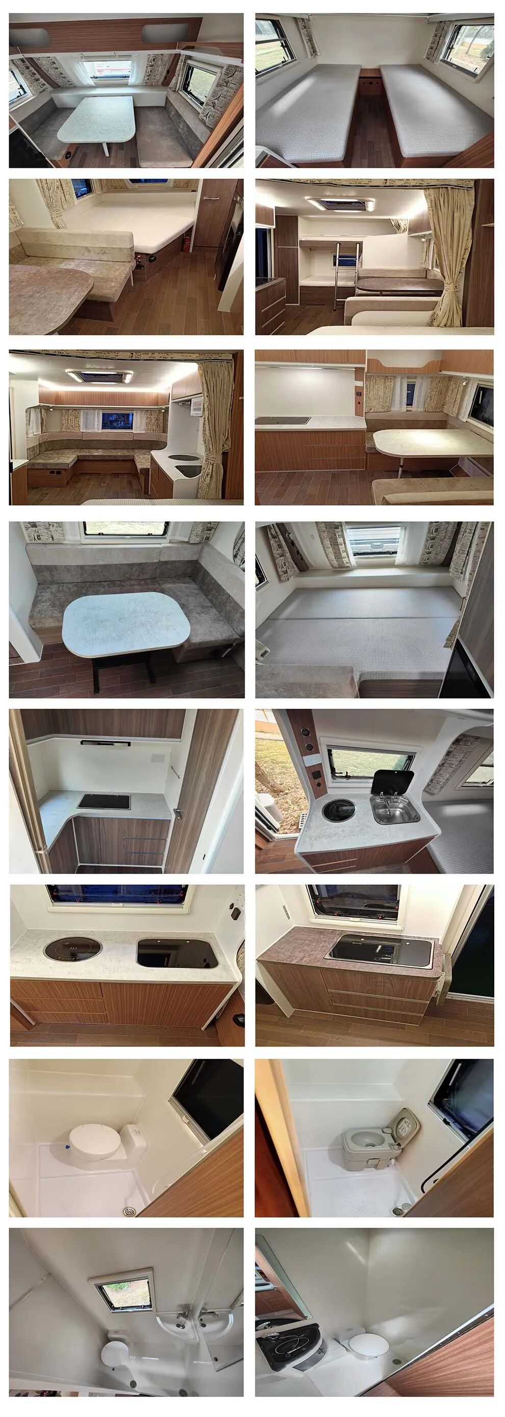 车厢顶部封闭,不可开启;牵引杆深入量为50mm,连接器最大负荷95kg;选装遮阳棚时车宽2250mm,未选装时车宽2150mm;厢体内安装有床铺、桌柜、卫生设施、炊事设施及娱乐设施等;该车非乘用车,行驶过程中不载人;根据内部布置,选装开窗位置及大小,选装舱门位置及大小,选装不同内饰风格;该车辆采用扭力杆悬架形式。