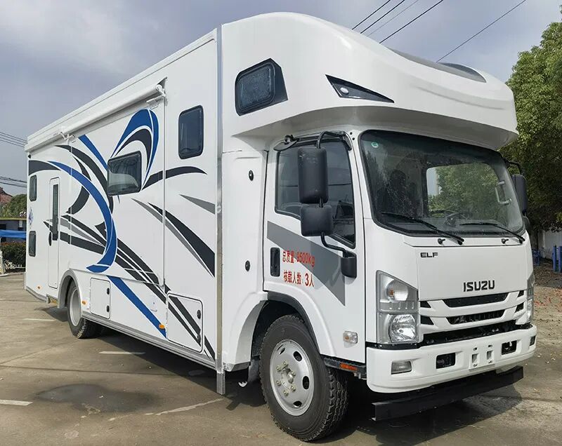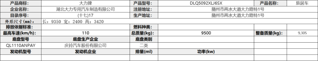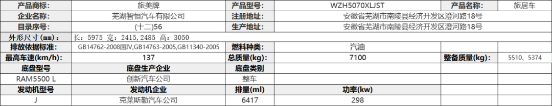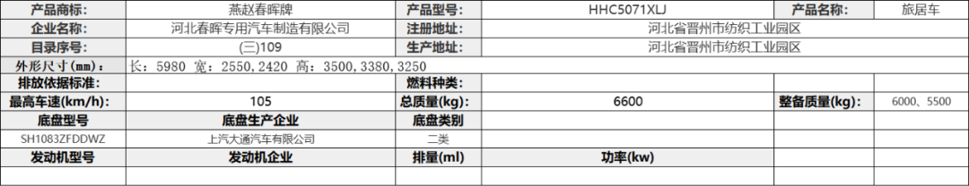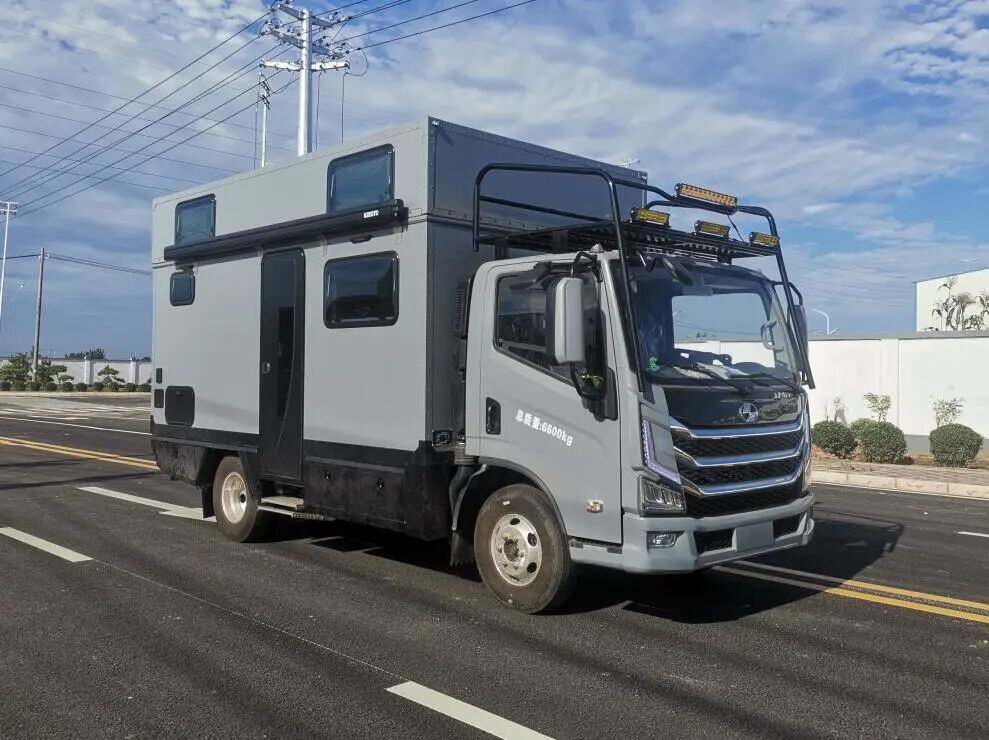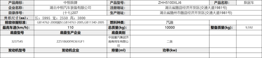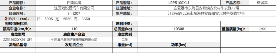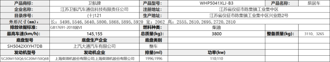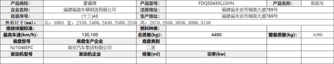 ABS 型号VIE ABS-Ⅱ,生产企业:浙江万安科技股份有限公司,ABS型号CM4XL-4S/4M,生产企业:广州瑞立科密汽车电子股份有限公司;仅选用3308mm轴距;SC28R150Q6发动机对应最大净功率为107.5kw,D30TCIF1发动机对应最大净功率为120kw,D25TCIF1发动机对应最大净功率为105kw;侧后防护材料材质:Q235;侧后防护连接方式:螺栓连接;后部防护装置:断面尺寸(mm):100×50;离地高度(mm):425;专用功能及装置:配备厨具,卧具,卫生洗浴等旅居生活设施和娱乐设施,顶部装有太阳能板;选装不带遮阳棚,选装厢体样式、内部装饰;该车型可选装ETC车载装置;车顶宿营照明灯具仅限于生活照明使用,行驶时不开启。