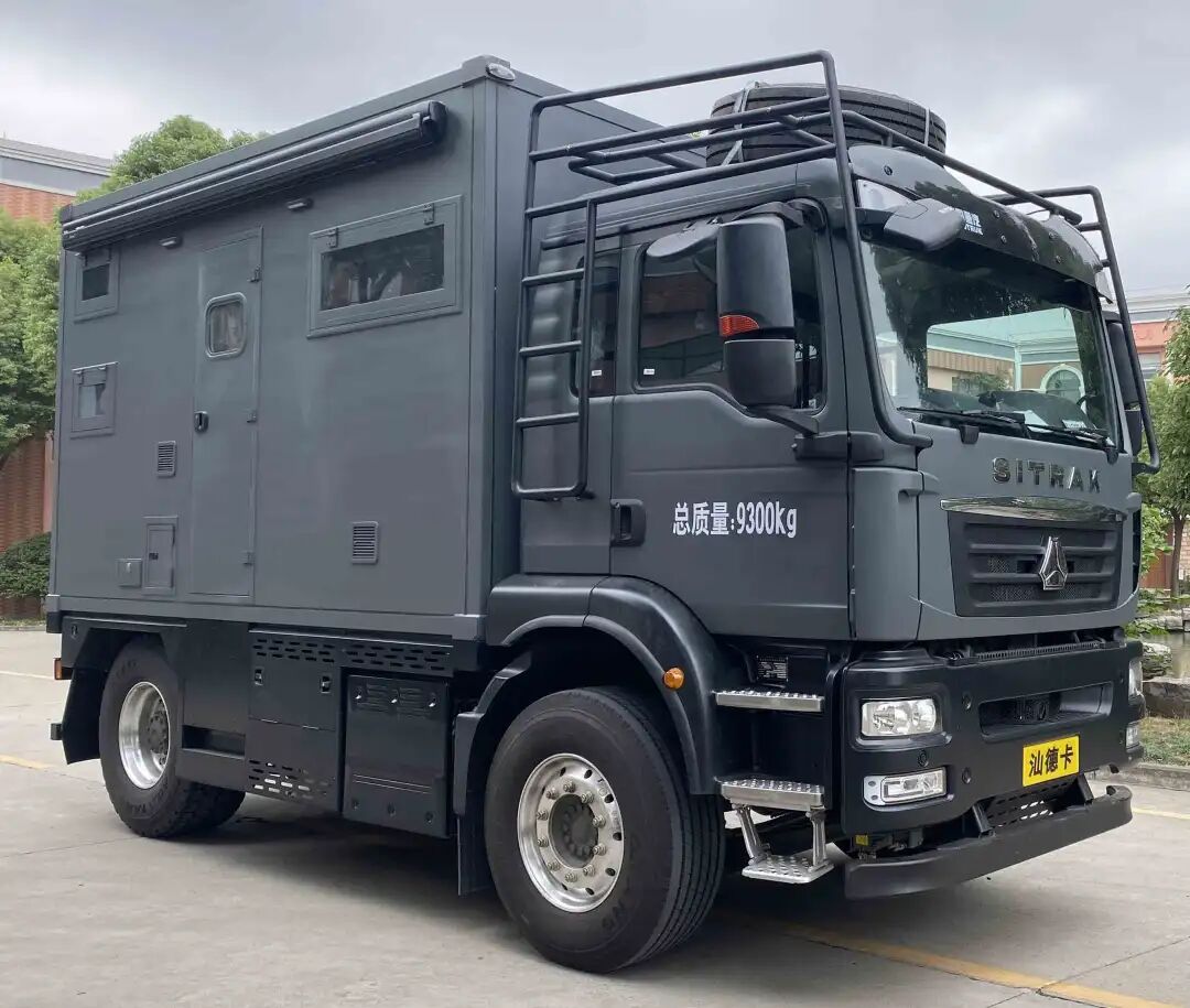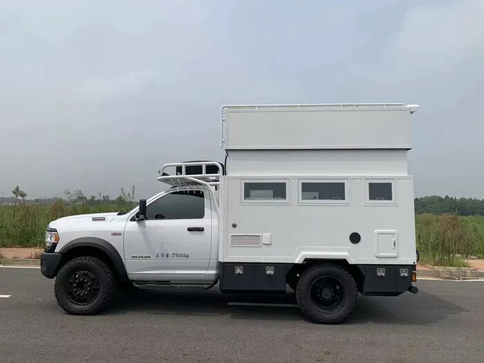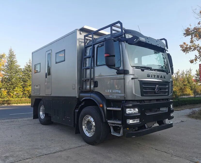 顶部封闭不可开启,该车设有专用装置;驻车娱乐休息区,睡具,炊具,储物柜,卫生设施等设施,用于旅游和野外工作人员旅居的专用汽车;后悬架形式:空气悬架,选装遮阳棚宽度2550mm,选装不带太阳能板高度3680mm。ABS系统控制器生产企业/型号为采埃孚商用车系统(青岛)有限公司/4460046300,侧防护为裙边结构,材质为Q235;后防护材质为Q235,后部防护断面尺寸(mm):100×50,后部防护离地高度(mm):425,连接方式为螺栓连接。选装直接供电ETC车载装置。右侧安装的照明灯,仅在驻车作业状态下使用。