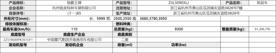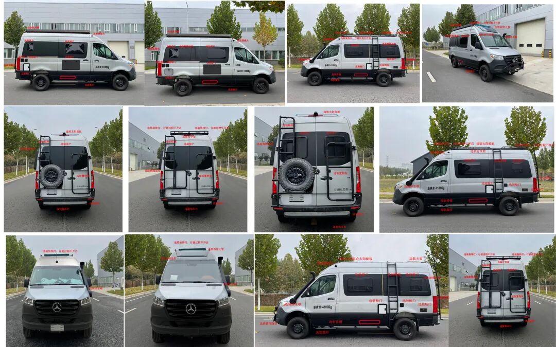 该车型配备桌椅、睡具、卫生设施、厨房设施等设施,用于旅行宿营;仅选用3600mm轴距;ABS系统控制器生产企业/型号为采埃孚商用车系统(青岛)有限公司/4460046300;左侧防护为裙边结构,由工具箱替代,材料为Q235,左侧防护离地高度380mm,右侧防护为裙边结构,由伸缩踏板和工具箱替代,材料为Q235,右侧防护离地高度520mm;后防护装置与车架尾部采用螺栓连接,截面尺寸100mm×100mm,材料为Q235,离地高度420mm;该车选装直接供电式ETC车载装置。