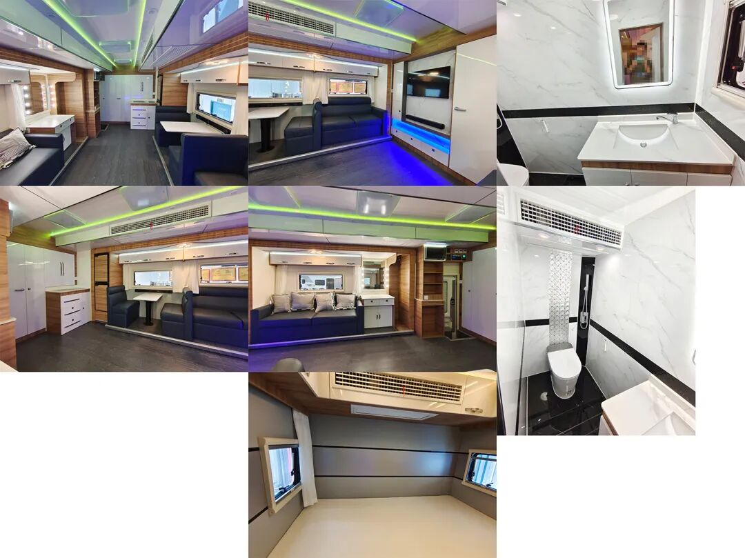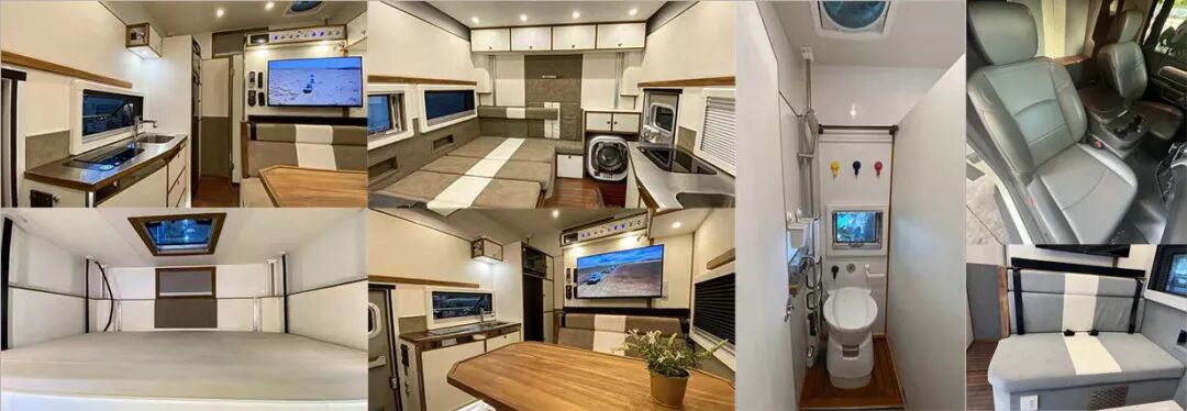 顶部封闭不可开启,顶部选装空调对应高度2610mm;选装换气扇对应高度2450mm;选装油烟机排风口对应高度2425mm;选装卫生间排风扇对应高度2400mm;可选装太阳能板、遮阳棚;牵引杆深入量60mm,连接器最大负荷130Kg;该车为非乘用车,行驶状态中不载人;厢体内安装有床铺、桌柜、厨具、卫生设施等旅居专用设备;车身采用裙边结构为铝制材料(QN-50P),后防护离地高度490mm。