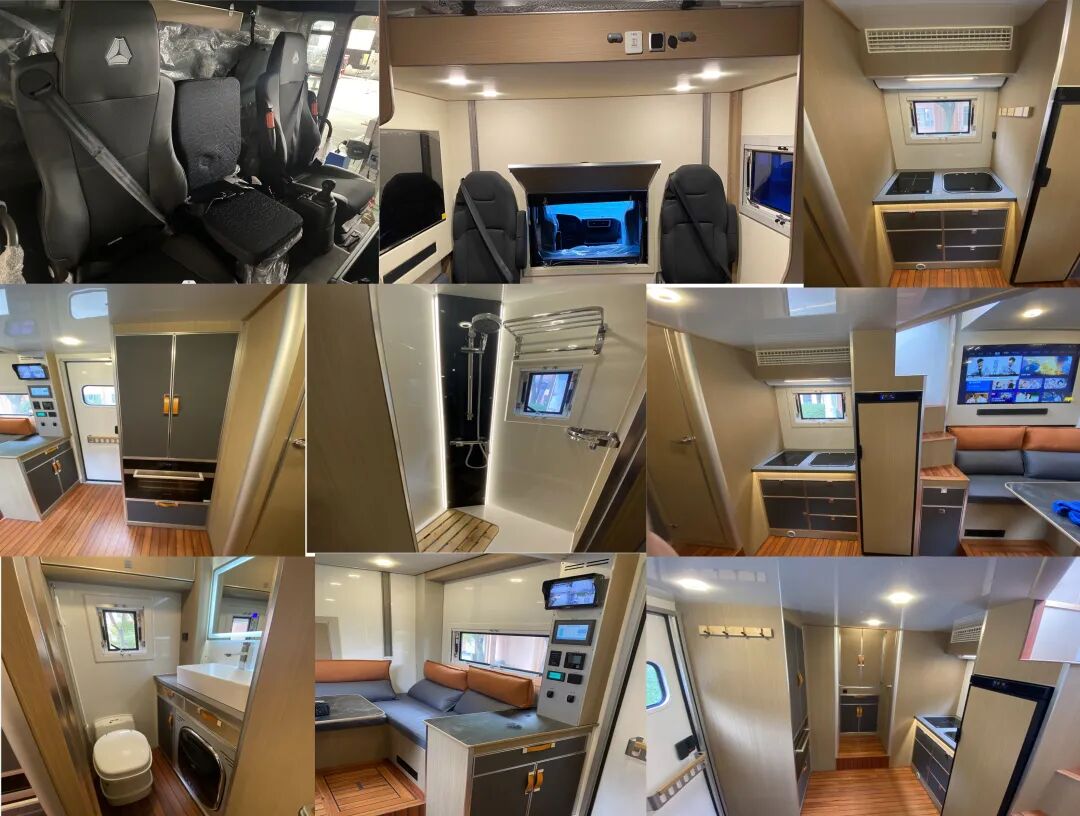 该车型配备桌椅、睡具、卫生设施、厨房设施等设施,用于旅行宿营;仅选用3600mm轴距;ABS系统控制器生产企业/型号为:采埃孚商用车系统(青岛)有限公司/4460046300;侧防护为裙边结构,材料为Q235,侧防护离地高度410mm;后防护装置与车体采用焊接连接,截面尺寸120mm×80mm,材料为Q235,离地高度480mm;该车选装直接供电式ETC车载装置。前后悬架型式:空气悬架/空气悬架。
