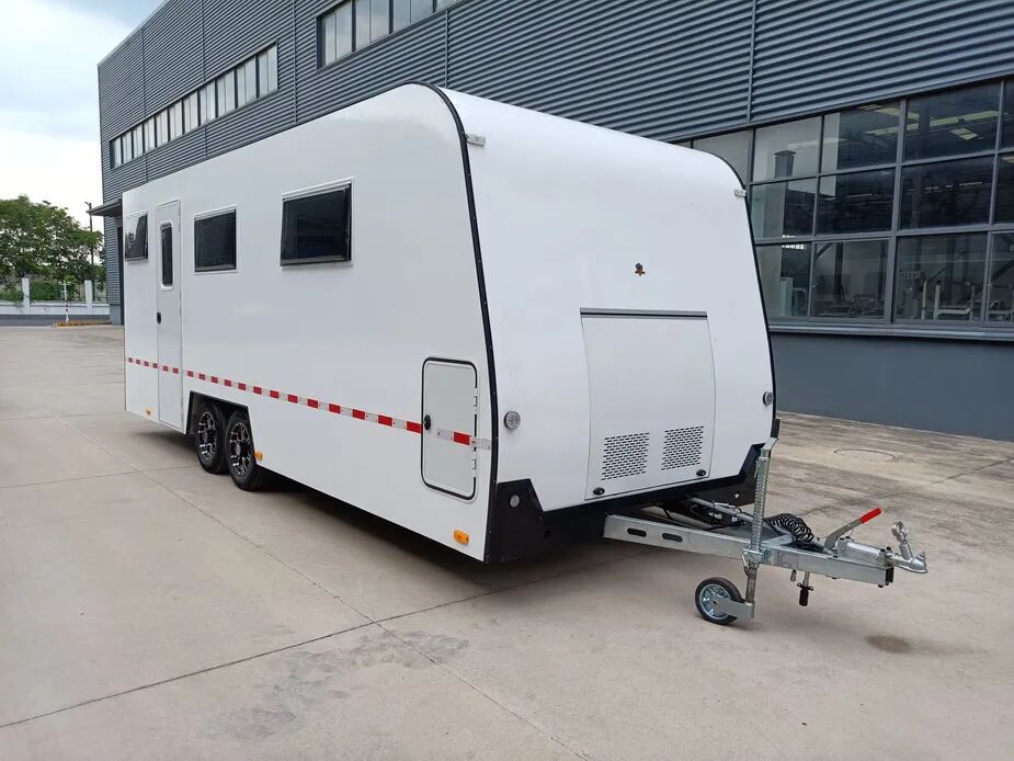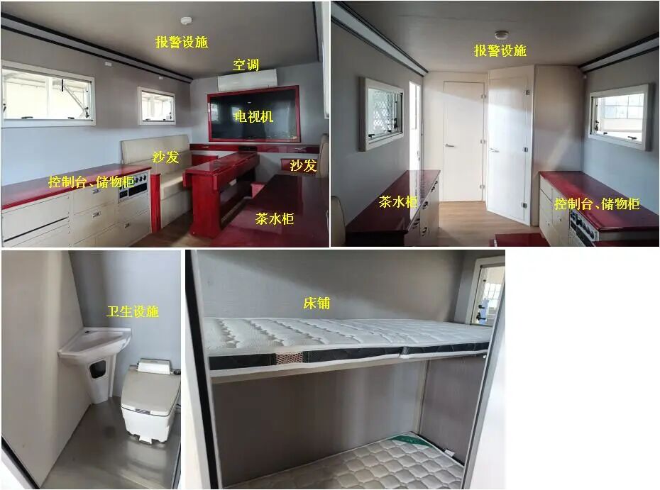 该车为非乘用车,行驶过程中不载人;牵引杆深入量为25mm;牵引杆连接器最大负荷210kg;该车配备沙发、控制台、茶水柜、储物柜、电视机、空调、床铺、卫生设施、报警设施、车载移动照明设备、遮阳棚等专用设备,主要用于人员自驾旅游宿营等。车顶可不选装车载移动照明设备,高度为2850mm;侧面可不选装遮阳棚,车宽为2380mm;该车采用独立弹簧悬架;顶部封闭不可以开启;车载移动照明设备仅在驻车作业时使用。