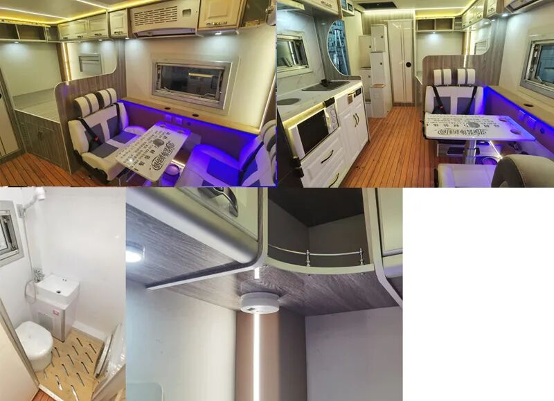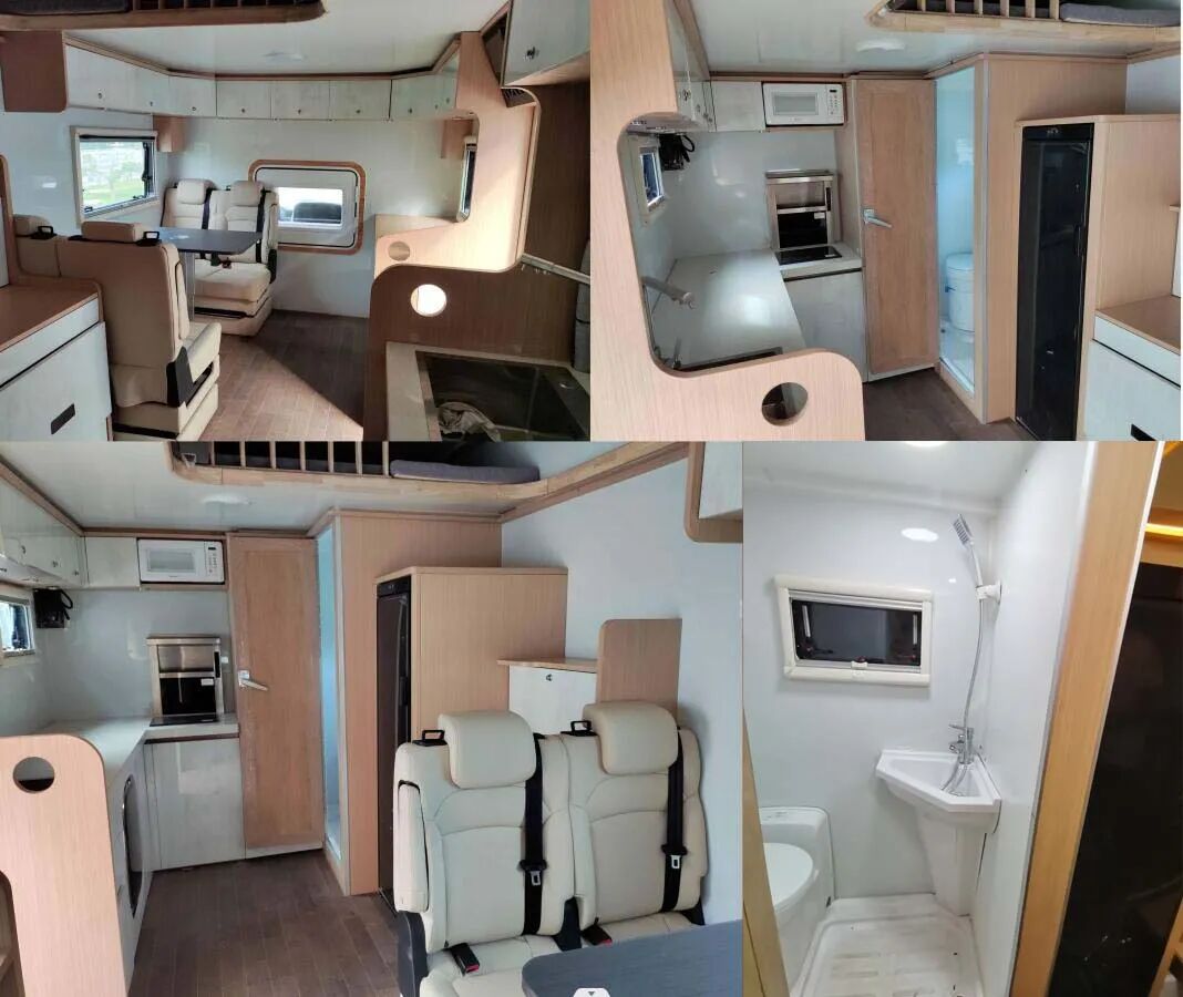 本车顶部安装有天窗,车顶结构为封闭结构,不可整体开启;车身左右门窗及舱门可根据内部布局调整位置;本车非乘用车,行驶过程中不载人;本车装有厨具、睡具、沙发等旅居车专用设施;牵引杆深入量为60mm;本车车顶可选装空调、太阳能板、卫星天线;车头选装小窗口,选装太阳能换气扇。连接器最大负荷100kg;车身为裙边厢结构代替防护装置,离地高450mm。