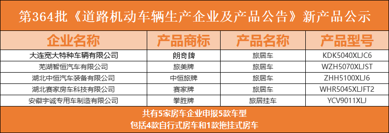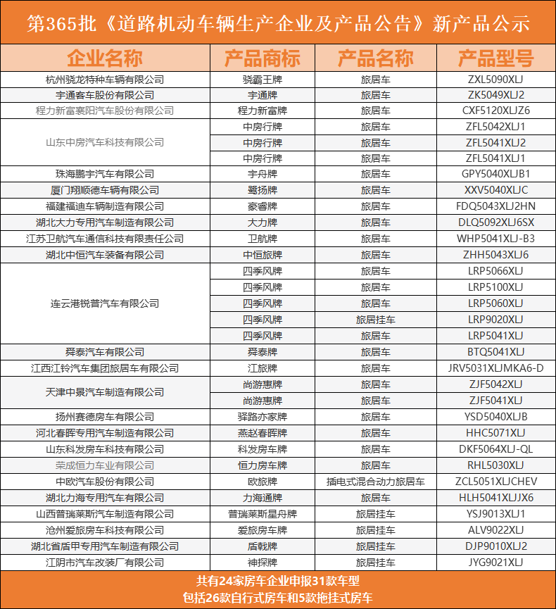 2022年10月25日、11月16日,国家工业和信息化部在官方网站相继公示了364、365批关于《道路机动车辆生产企业及产品公告》(以下简称《公告》)新产品,其中第364批属于增发公告,共有5家房车企业申报了5款车型,包括4款自行式房车和1款拖挂式房车;第365批属于整车发布的公告,共有24家房车企业申报了31款车型,包括26款自行式房车和5款拖挂式房车,其中宇通申报首款奔驰底盘房车;申报车型种类上,轻卡、重卡房车占比明显增多。