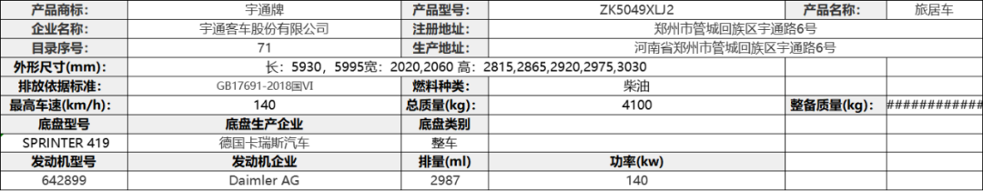 该车配备卧具、厨具、卫生设施等旅居生活设施,用于旅行宿营;选装高配置时整备质量3700kg,选装标准配置时整备质量3650kg或3550kg,选装简单配置时整备质量3450kg或3350kg,整备质量3700Kg只对应2-5额定载客;ABS型号:ABS ESP 8.1;ABS生产企业:BOSCH;发动机净功率值:140kW;车辆前部可选装装饰工作灯,装饰工作灯行驶过程中不可开启;该车型可选装ETC车载装置;该车选装牵引挂车,准拖挂车总质量为2000kg,牵引杆深入量为160mm,牵引杆不影响整车长度。