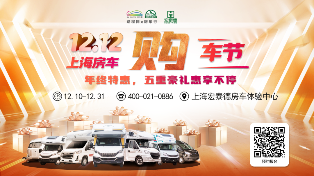双十二上海房车购车节-宏泰德房车旗舰店专场即将于12月10日正式启动,年终钜惠,购车纵享五重豪礼,特定车型最高优惠8W,还有超级特惠车型-景途B1房车(原价42.8W,活动价29.99W,直降14W,尊享100Ah锂电免费升级400Ah服务)限量9台等你来抢!