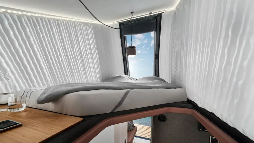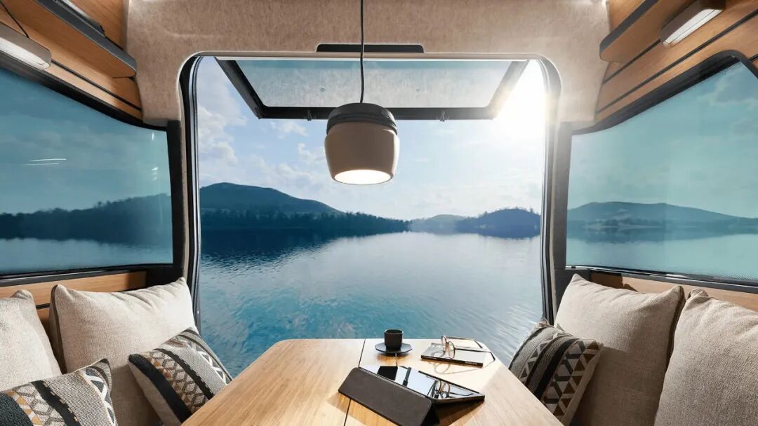 车的尾部是休闲区,由对坐卡座和可折叠餐桌组成,白天可以在这里享受你的悠闲时光,晚上可将餐桌折叠后存放在椅子下方,整体拼接成一张床,当作额外的睡眠区;当尾门关闭时,弧形3D全景真实玻璃窗能提供180°的室外视野,并让车内充满阳光,不仅加强了采光,还能欣赏到沿途中不同的风光;尾门向上折叠时,这里就变成了开放式休闲区,成为你的专属露台,除了通过车内部到达外,还可以通过外部的活梯轻松到达。