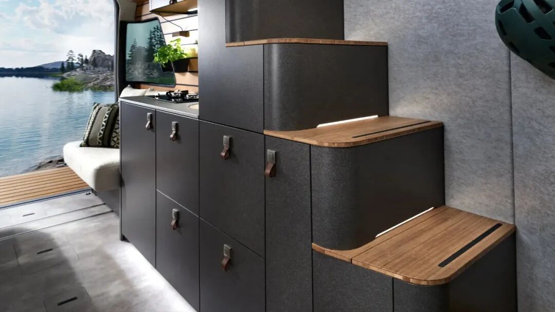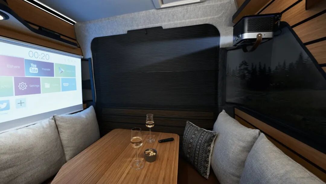 休闲区还可以变成你的私人影院,独家的Alphatronics投影仪可以将你想看的影视剧投放到随附的屏幕上,同时车内还配备了SonosRoam移动条形音箱,能让你享受到影院级的视听盛宴。投影仪和音响都可以轻松的固定在多功能墙上,除此之外你还可以挂上任何你想放的物品,将空间的利用率提升到了极致。