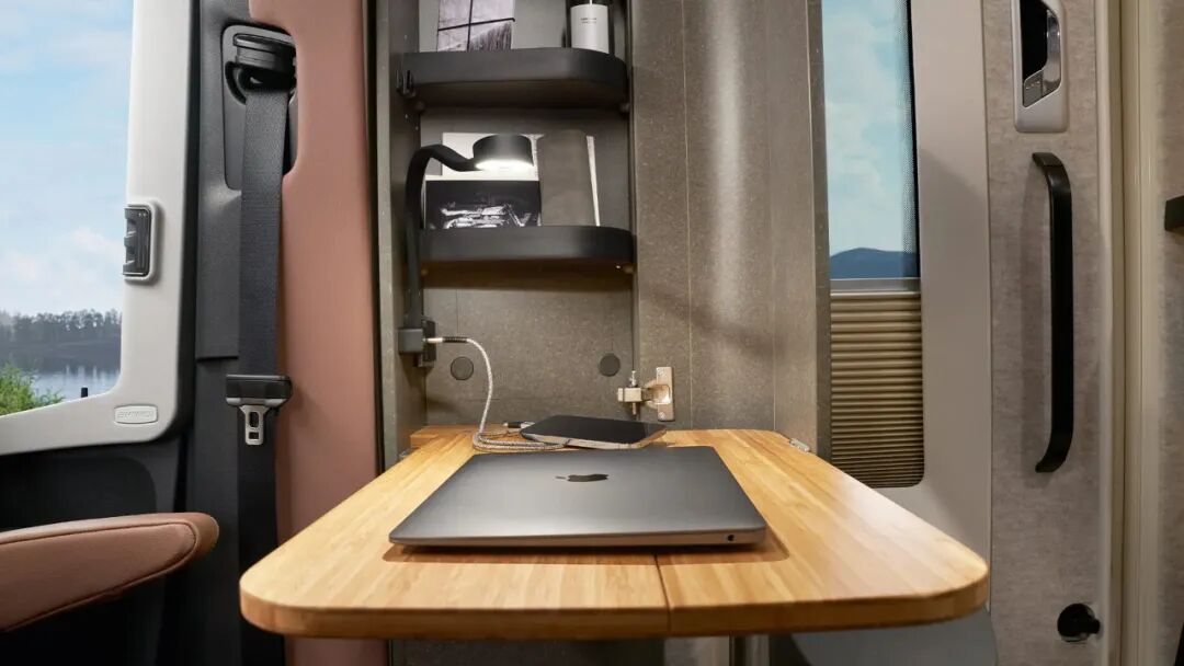 我们从房车中门进来之后,右侧就是驾驶室,副驾驶的座椅是可旋转的,车内侧壁中还可收纳一个折叠桌,当你需要工作或者想要打游戏时,就可以开启这些功能;侧壁内还精心布置了230V插座、USB充电口,让你不会为了电量耗尽而担忧。