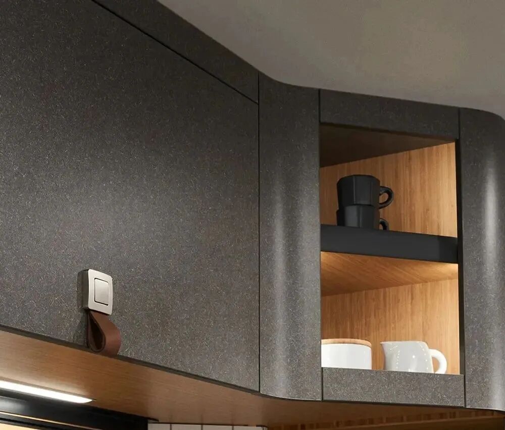 开放式小厨房整体设计上很有质感,台面采用金属表面和哑光饰面,耐指纹和划痕,必要时甚至可以进行热修复,功能多样;墙面的瓷砖由基于粉状石材的固体表面复合材料制成,搭配高级哑光的黑色配件,增添了时尚气息和复古感。