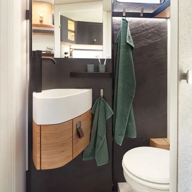 卫浴间是生活中不可或缺的一部分,HYMER Venture S在浴室上增添了旋转拓展式创新设计,完美做到了干湿分离。你只需要旋转一面墙,就可将淋雨室与马桶、洗脸盆、镜柜等相分离;浴室外旁还设置了落地衣柜,有足够的空间放置衣服。