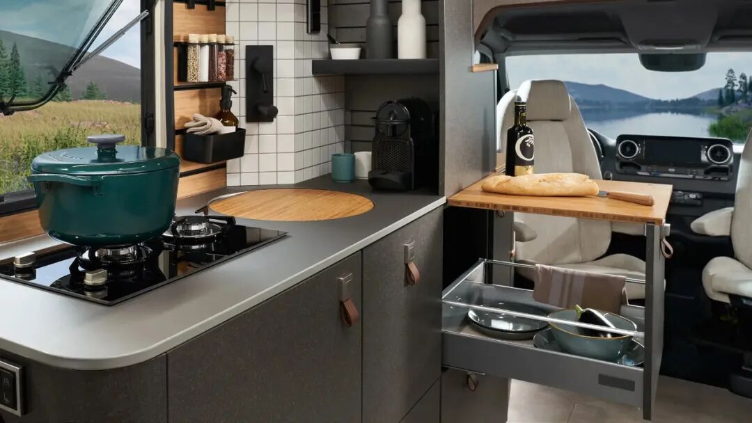 出色的便利性、丰富的储物空间是这个厨房的特点,你可以从右侧柜台下方拉出作为扩展台面的砧板和储物盒,节省了占地空间;台面的上下是储物柜,可以存放全套餐具和一些电器用品等;另外,厨房还配置了双眼燃气灶、水龙头、水槽、咖啡机等常用设备,满足外出旅行的简单做饭需求。